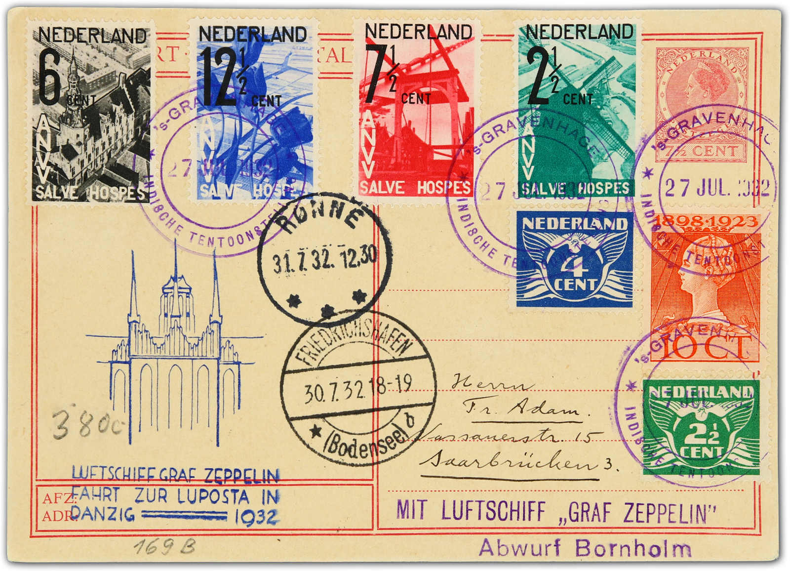 9648 Brief MichelZeppelinundLuftp image1932, LUPOSTA-Fahrt, Zuleitungspost NIEDERLANDE, Etappe Friedrichshafen - Danzig - Rönne, GA-Karte mit attraktiver Zusatzfrankatur ab S´Gravenhage 27.7.32 via Friedrichshafen 30.7. nach Danzig und dann auf der Rundfahrt über Rönne 31.7 abgeworfen, adressiert nach Saarbrücken, nur 45 Stück bekannt (Image) (imagea)