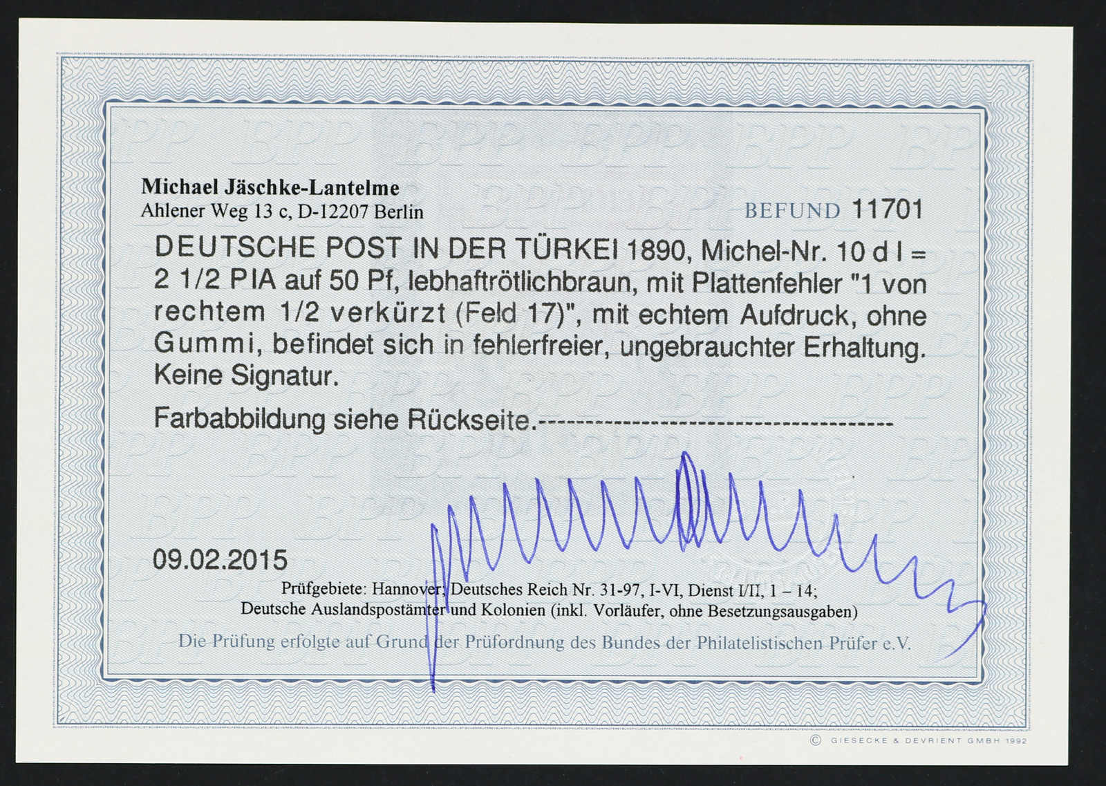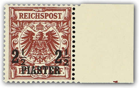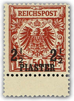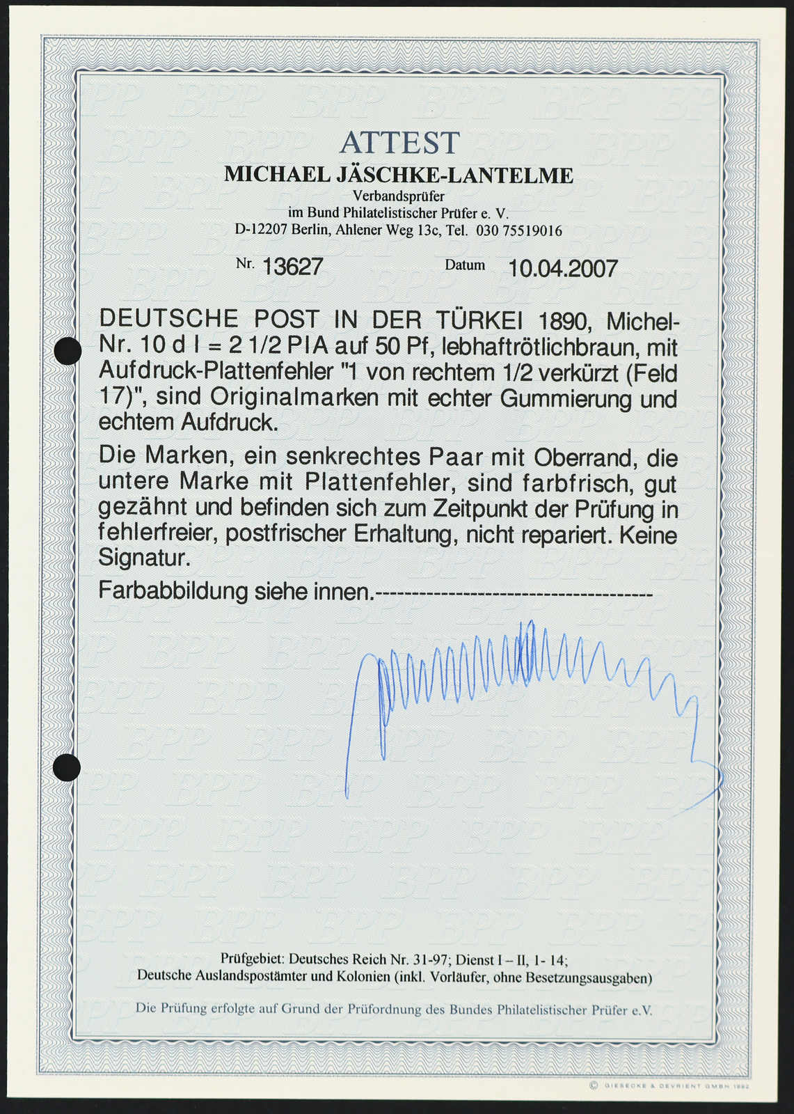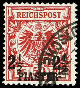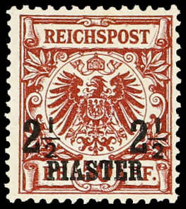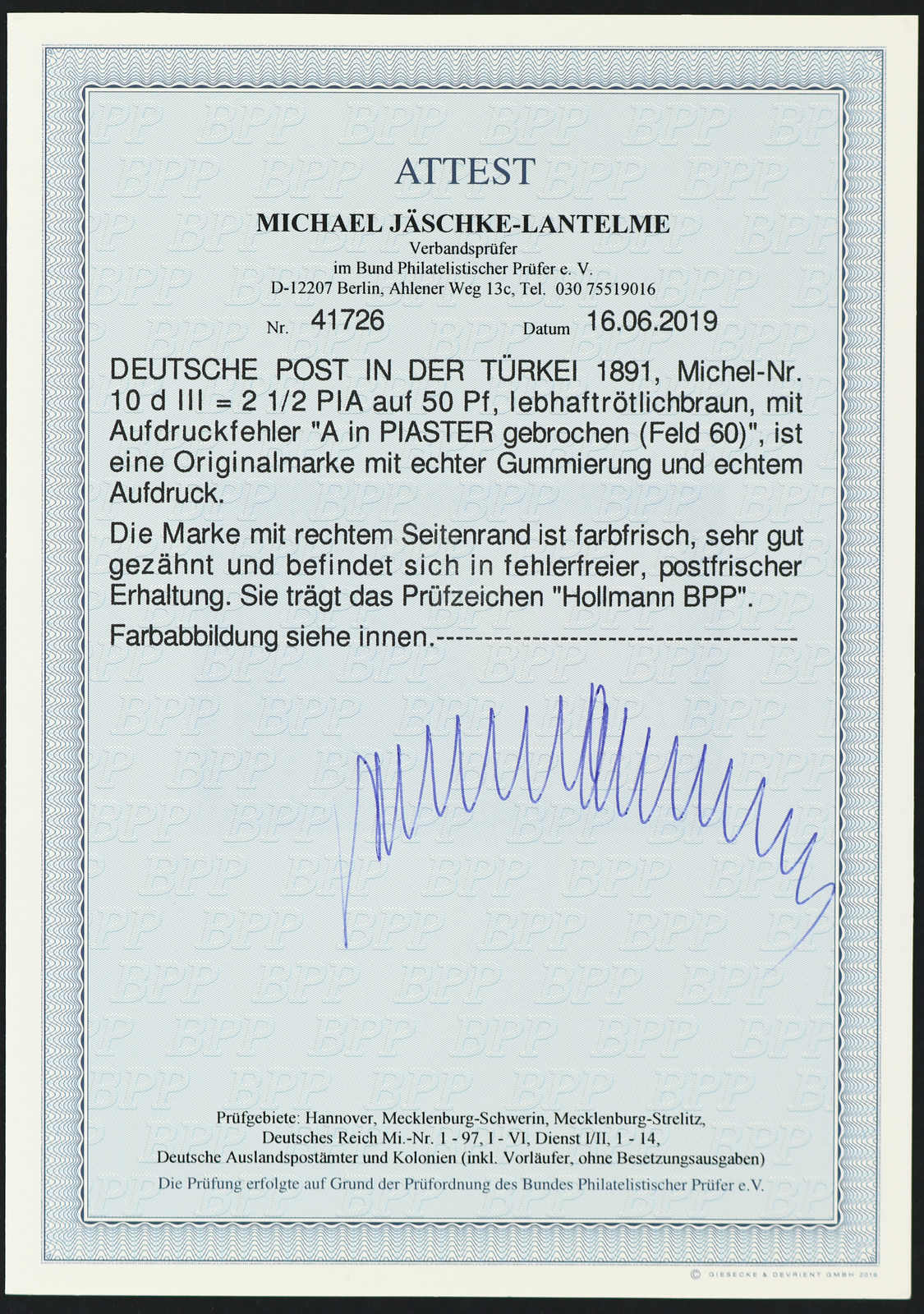 1891, 2½ PIA auf 50 Pfg. Aufdruckausgabe lebhaftrötlichbraun, mit Aufdruckfehler "A in PIASTER" gebrochen, ungebraucht, einwandfrei, Fotoattest Jäschke-Lantelme BPP (ME 700,-) (Image) (imagea)