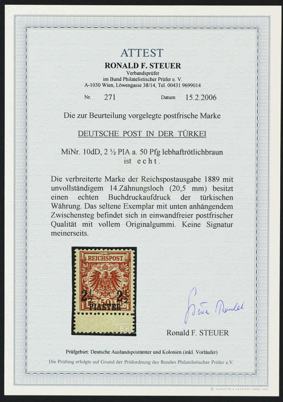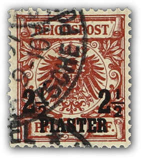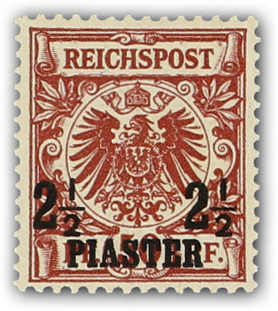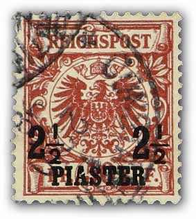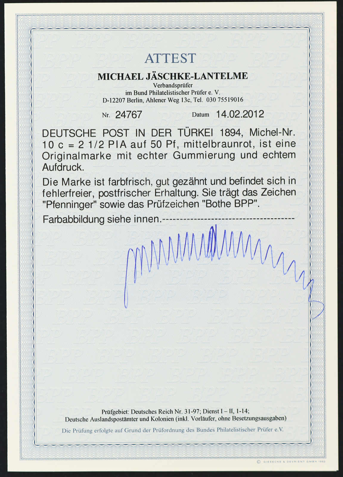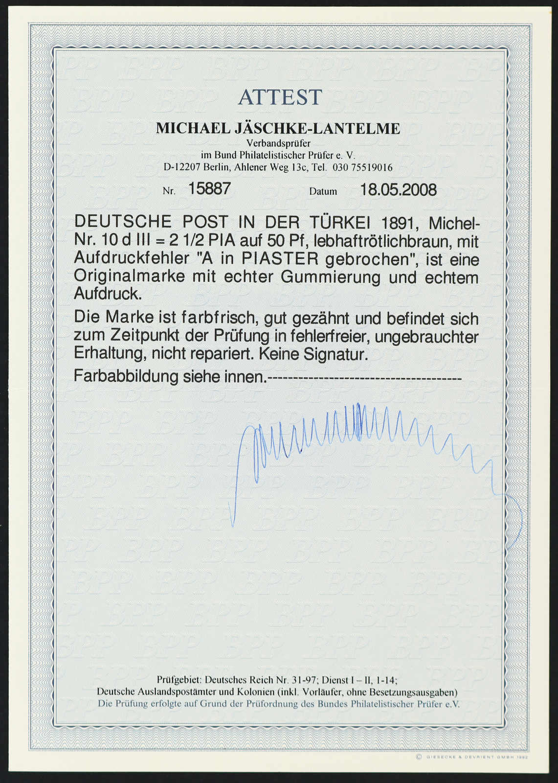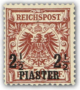 1891, 2½ PIA auf 50 Pfg. Aufdruckausgabe lebhaftrötlichbraun, mit Aufdruckfehler "A in PIASTER" gebrochen, ungebraucht, einwandfrei, Fotoattest Jäschke-Lantelme BPP (ME 700,-) (Image) (imagea)