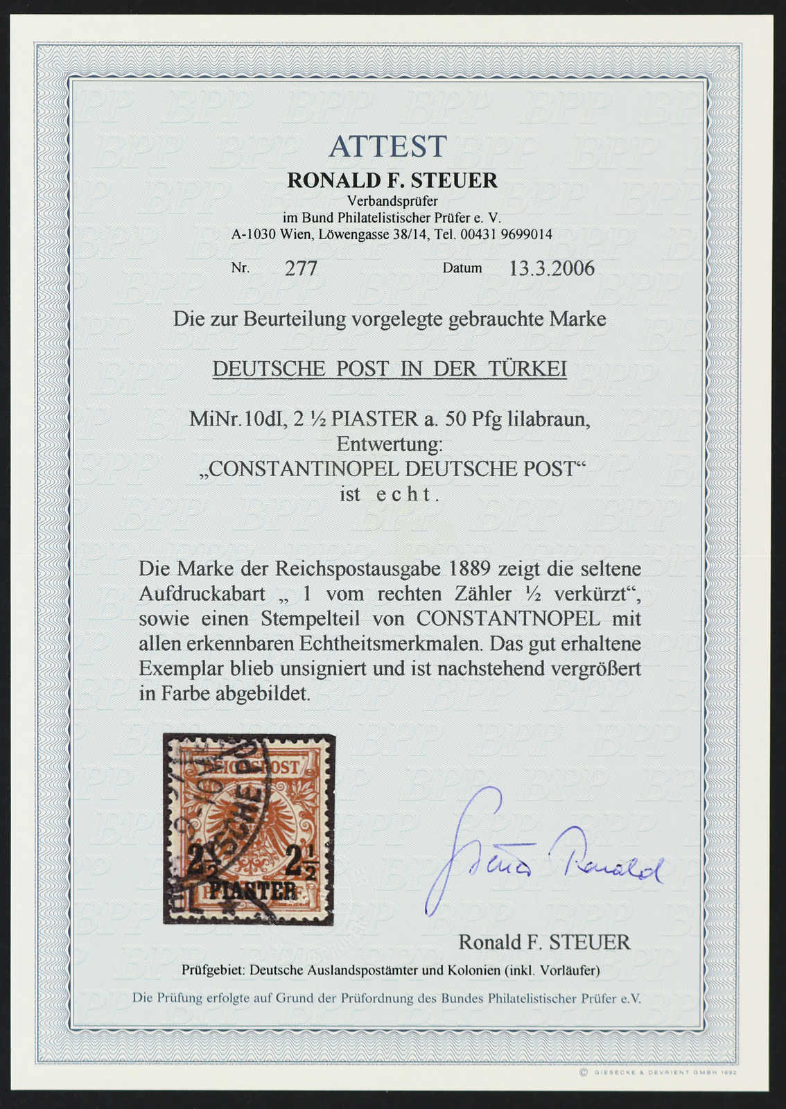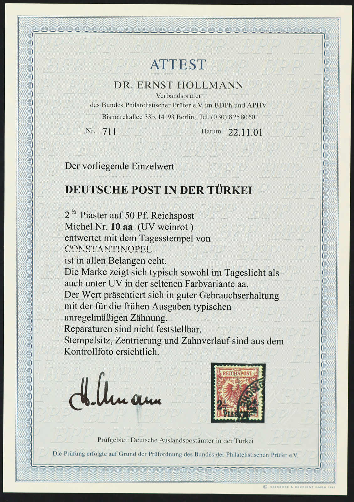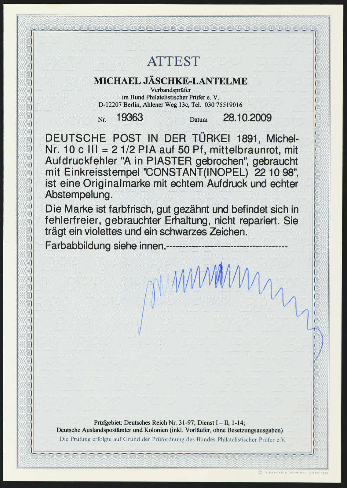 1891, 2¼ PIA auf 50 Pfg. Aufdruckausgabe mittelbraunrot, mit Aufdruckfehler "A in PIASTER gebrochen", gestempelt "CONSTANT(INOPEL) 22 10 98", farbfrisch, einwandfrei, signiert, Fotoattest Jäschke-Lantelme BPP (ME 600,-) (Image) (imagea)