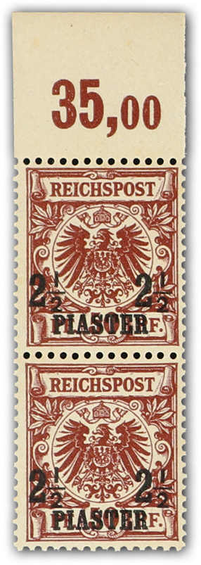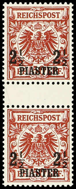 1890, 2½ PIA auf 50 Pfg. Aufdruckausgabe lebhaftrötlichbraun, senkrechtes Paar vom Oberrand, die untere Marke mit Aufdruckfehler "1 vom rechten ½ verkürzt", postfrisch, einwandfrei, unsigniert, Fotoattest Jäschke-Lantelme BPP (ME
