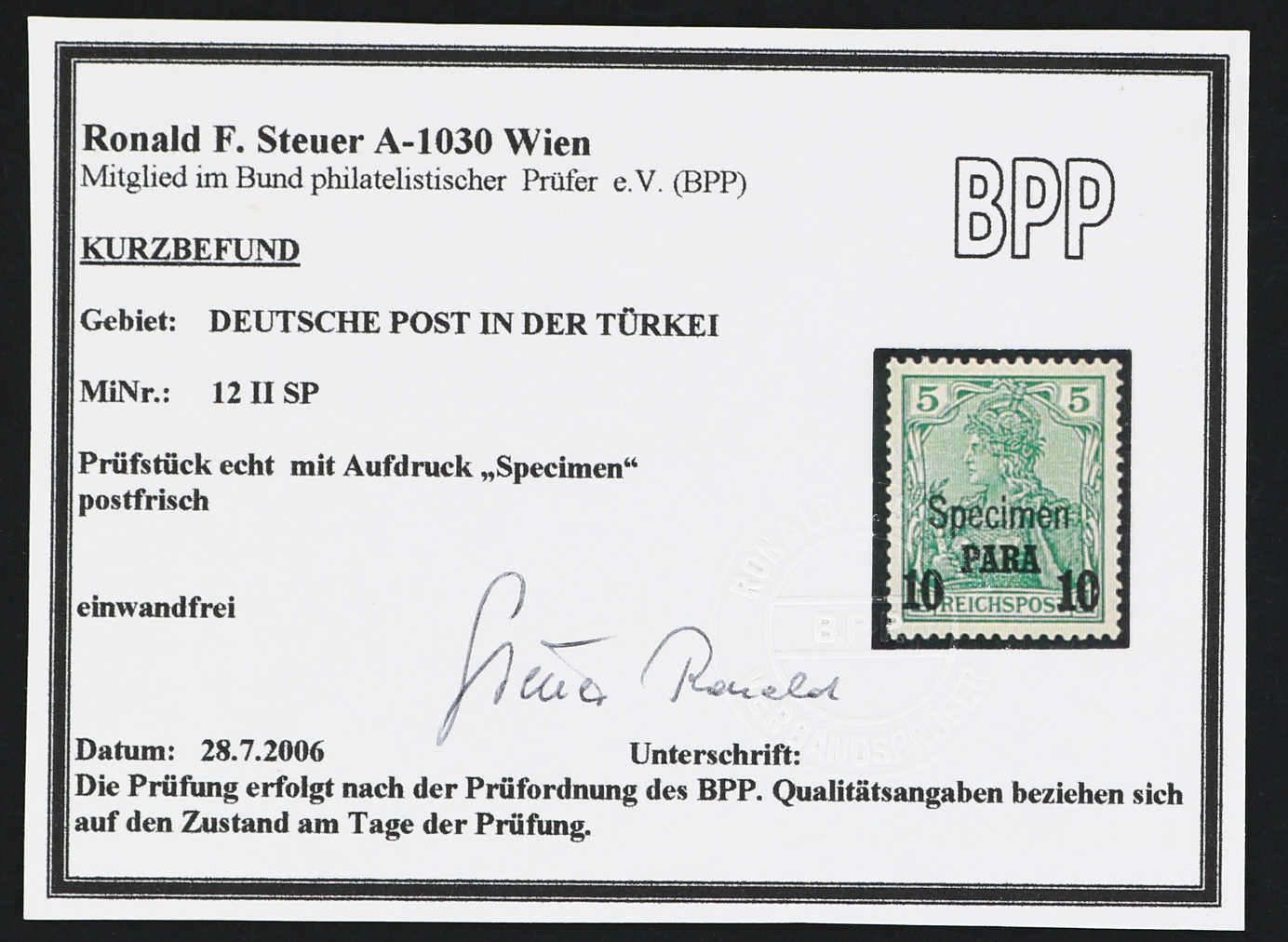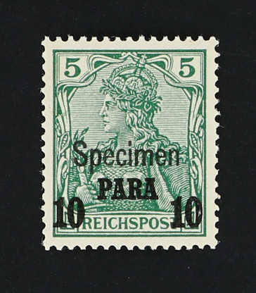 1904, 10 PA auf 5 Pfg. Aufdruckausgabe (dunkel)grün, Aufdrucktype II, mit Aufdruck "Specimen", postfrisch, einwandfrei, Kurzbefund Steuer BPP (ME 350,-)