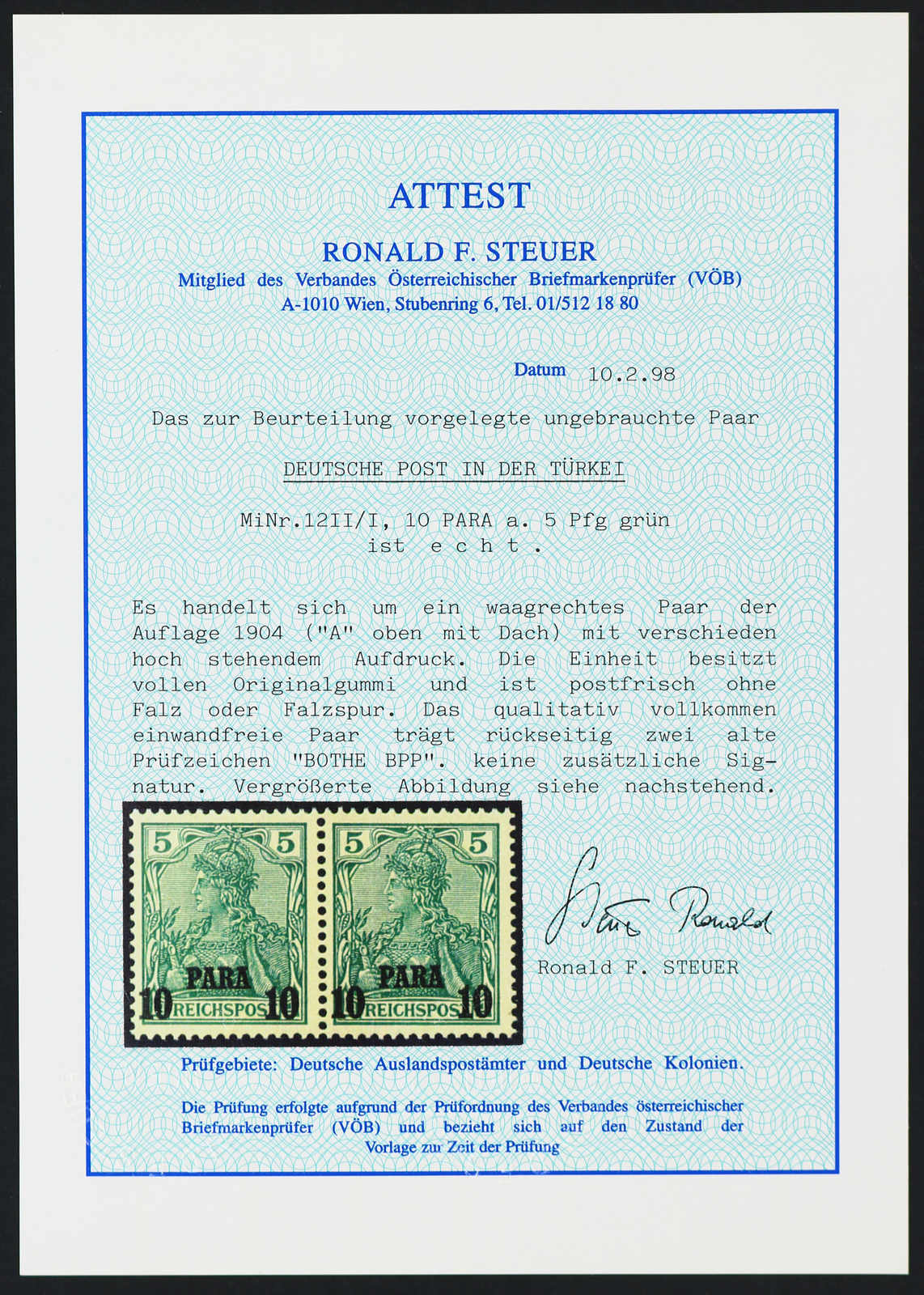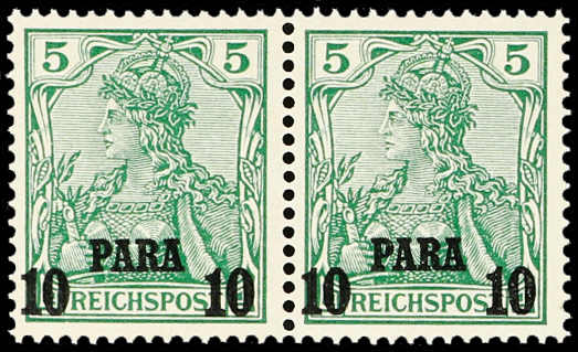 1904, 10 PA auf 5 Pfg. Aufdruckausgabe grün, waagerechtes Paar mit verschieden hoch stehendem Aufdruck, postfrisch in einwandfreier Qualität, geprüft Bothe BPP, Fotoattest Steuer VÖB (ME 550,-) (Image) (imagea)