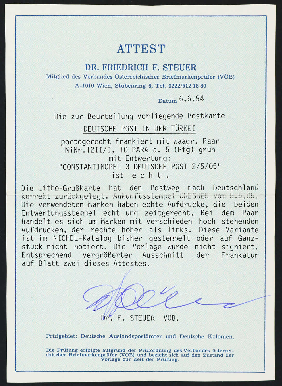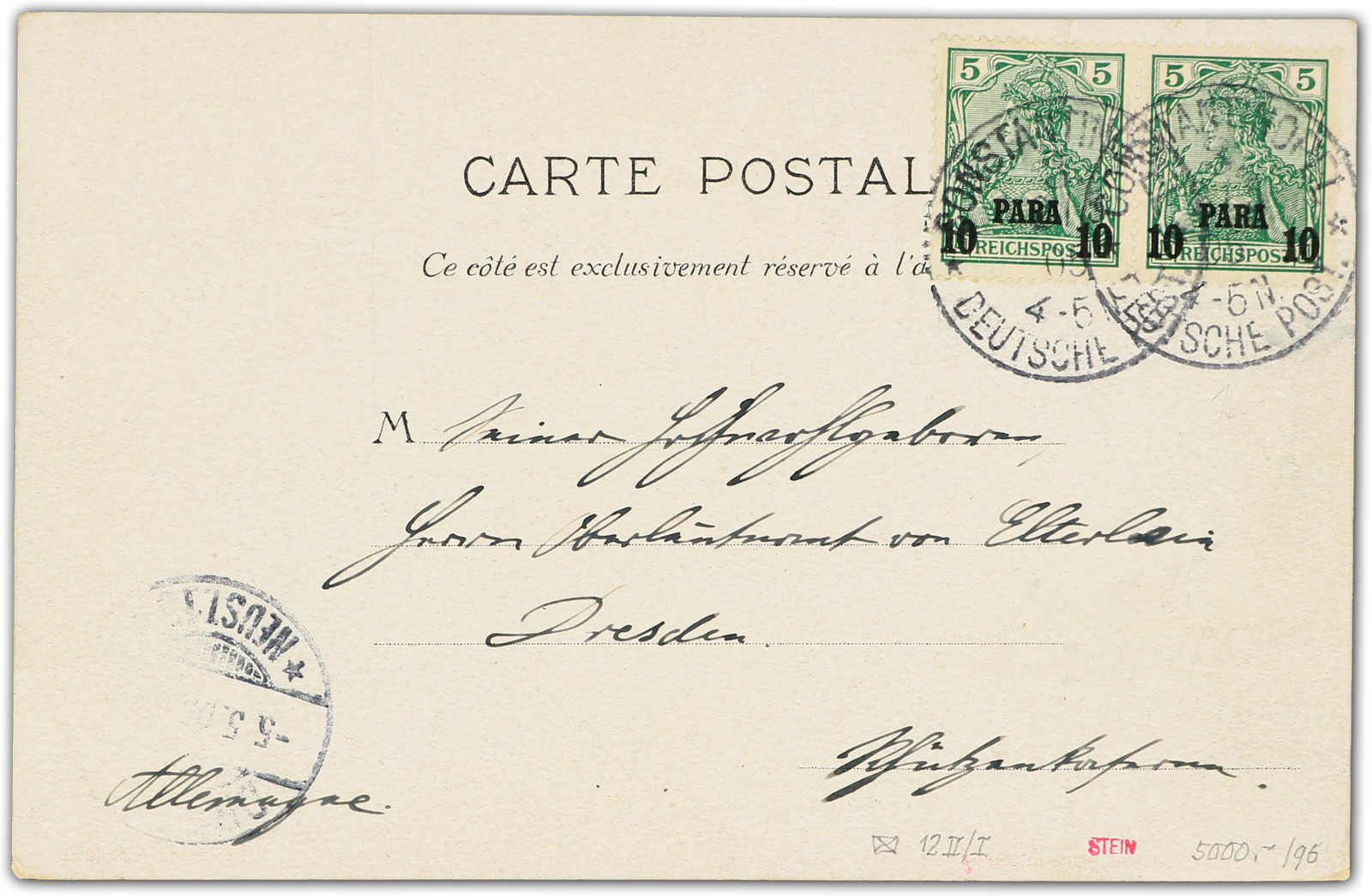 1904, 10 PA auf 5 Pfg. Aufdruckausgabe grün, waagerechtes Paar mit verschieden hoch stehendem Aufdruck als portogerechte Mehrfachfrankatur auf Lithokarte nach Dresden mit Ankunftsstempel, jeder Wert glasklar entwertet "CONSTANTINOPEL 3