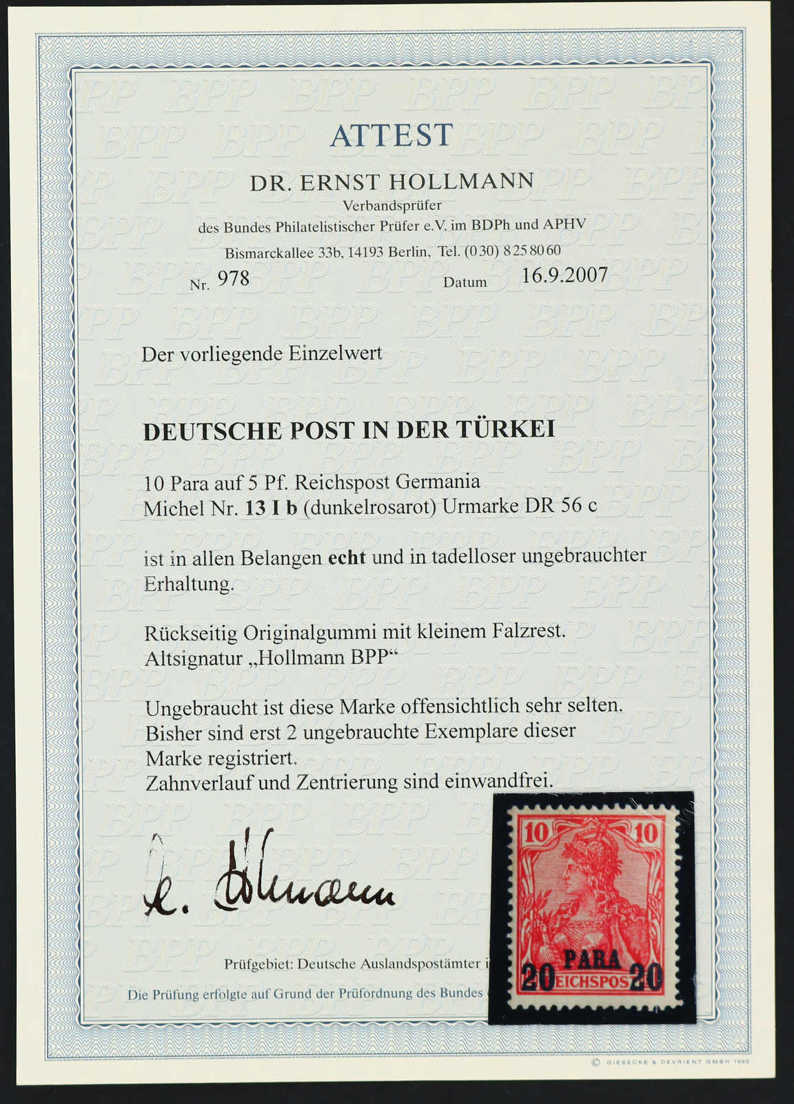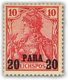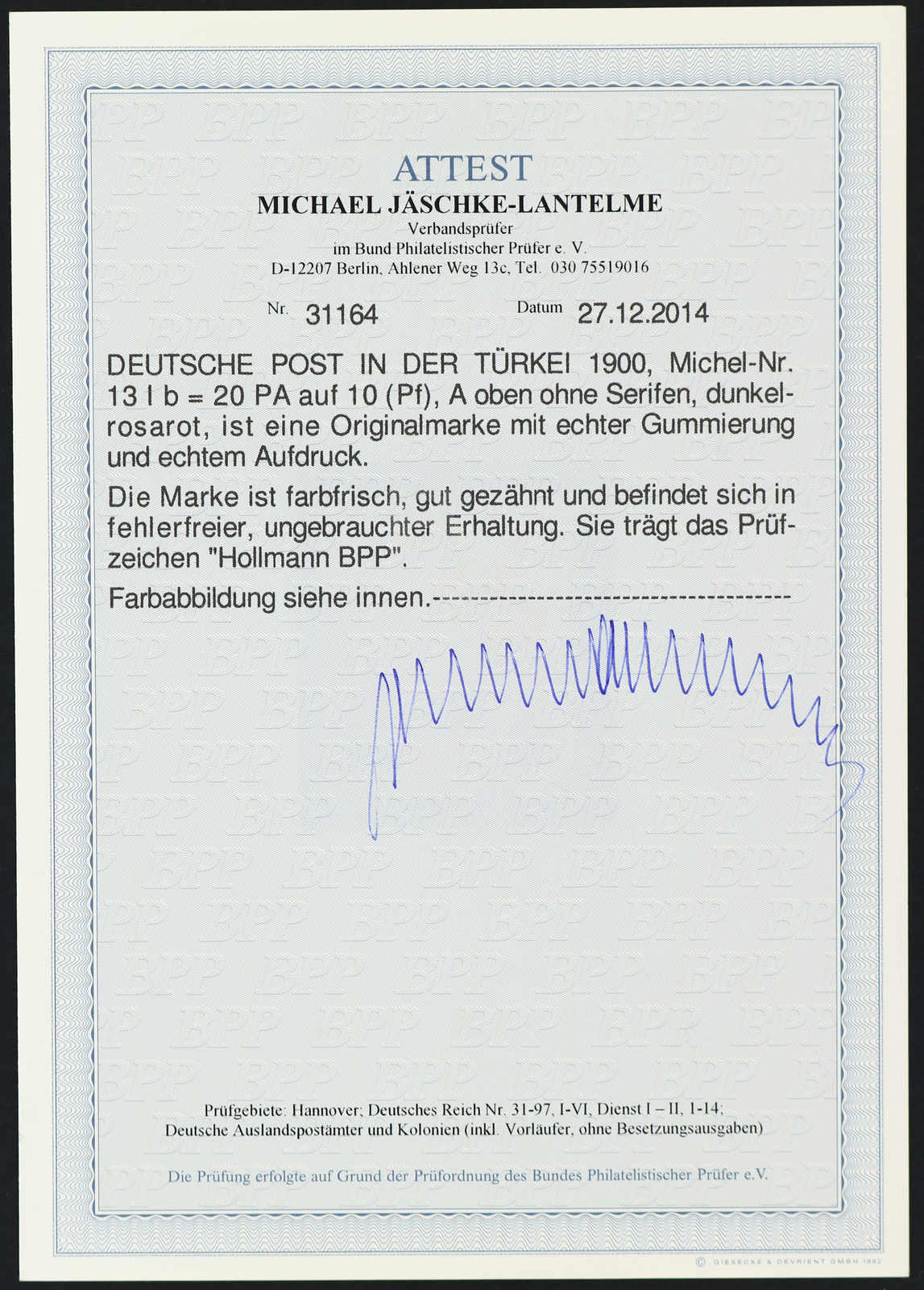 1900, 20 PA auf 10 Pfg. Aufdruckausgabe dunkelrosarot, Aufdruck-A oben ohne Serifen, ungebraucht, einwandfrei, geprüft Hollmann BPP, sehr selten, nur wenige ungebrauchte Exemplare sind bekannt! Fotoattest Jäschke-Lantelme BPP (ME