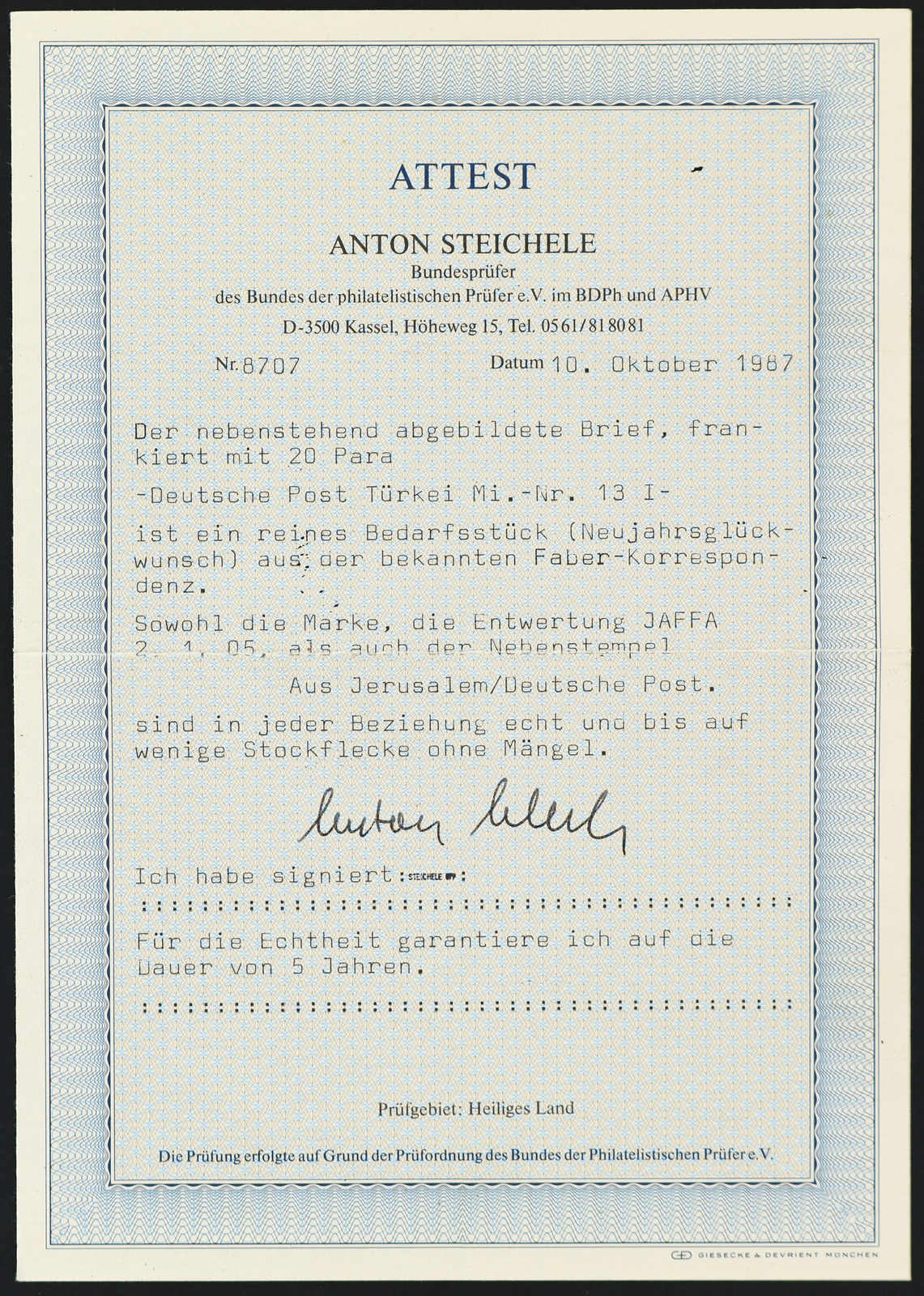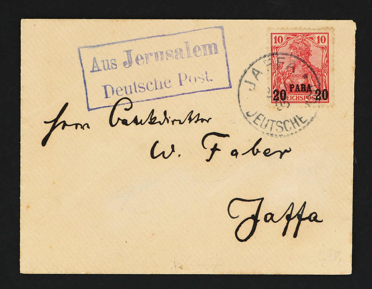1900, 20 PA auf 10 Pfg. Aufdruckausgabe dunkelrosarot, Aufdruck-A oben ohne Serifen, portogerechte Einzelfrankatur auf Brief mit blauviolettem Postablagestempel "Aus Jerusalem Deutsche Post." und klarer Entwertung "JAFFA 2/1 05", zwei