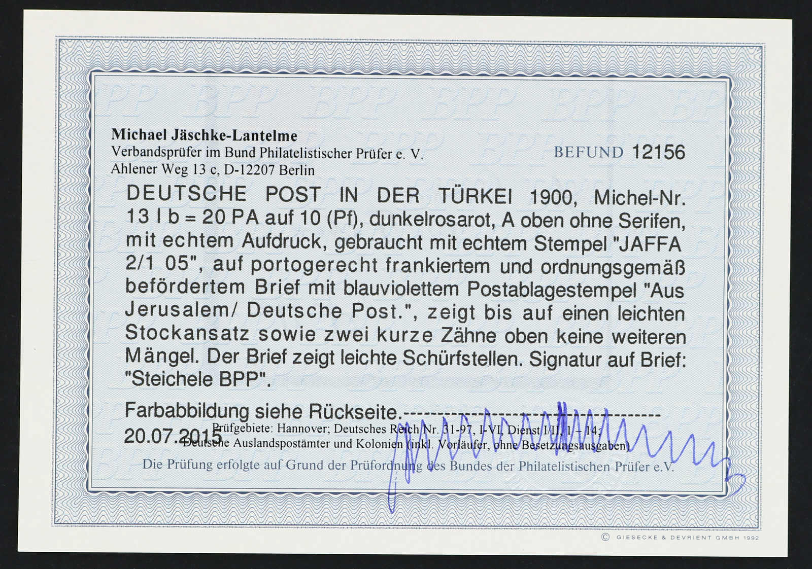 kurze Zähne, leichter Stockansatz, Umschlag leichte Schürfstellen, signiert und Fotoattest Steichele BPP, Fotobefund Jäschke-Lantelme BPP (ME 200,- + 150,- Stempelbewertung) (Image) (imagea)