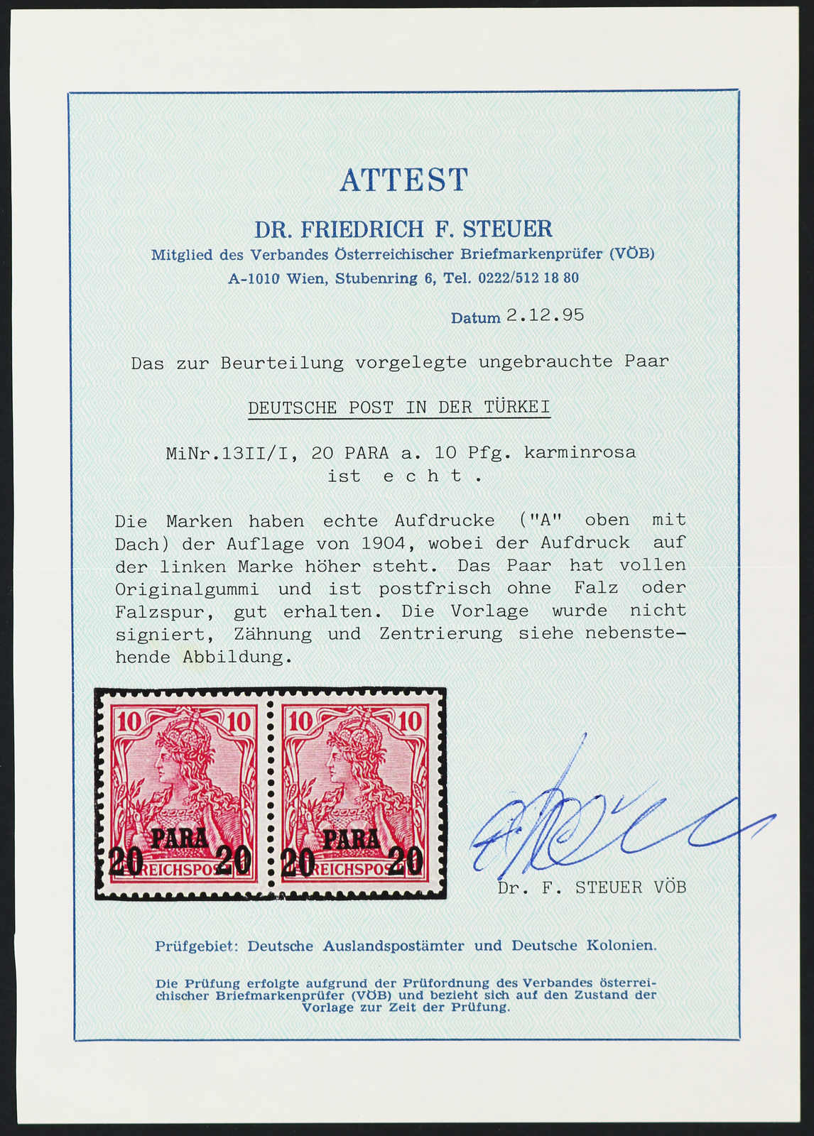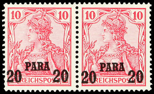 1904, 20 PA auf 10 Pfg. Aufdruckausgabe karminrosa, Aufdruck-A oben mit Serifen, waagerechtes Paar mit verschieden hoch stehendem Aufdruck, postfrisch, einwandfrei, Fotoattest Steuer VÖB (ME 550,-) (Image) (imagea)