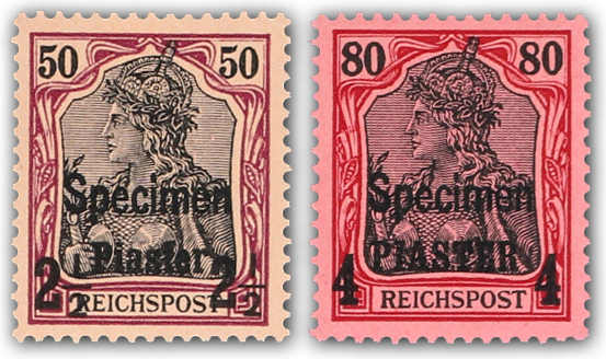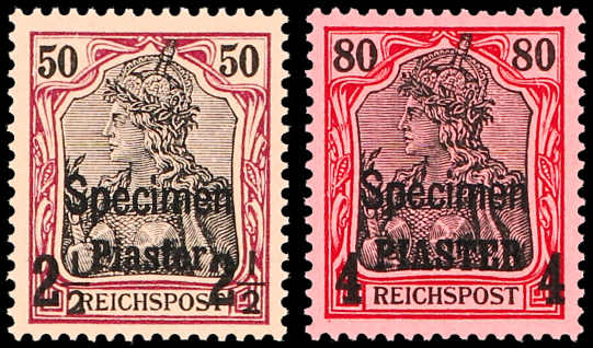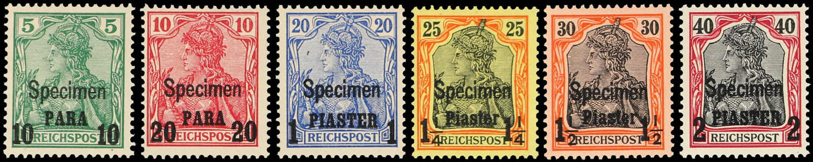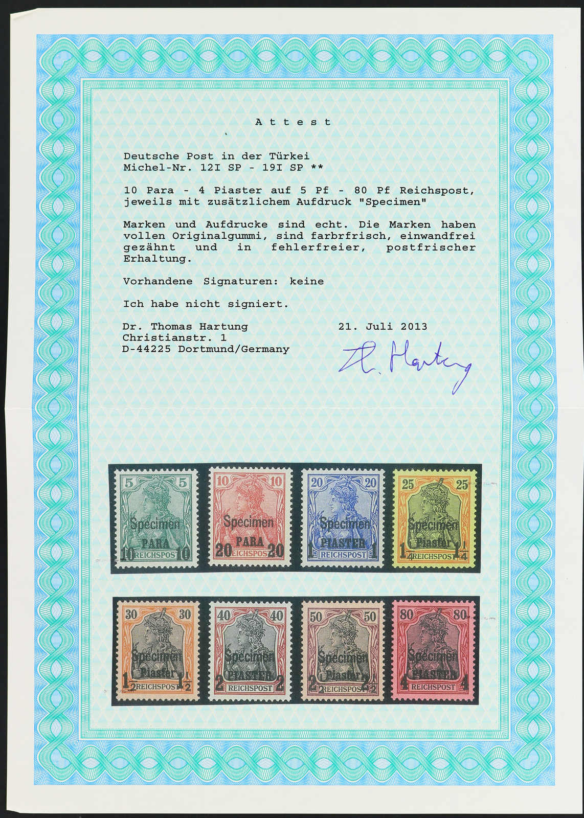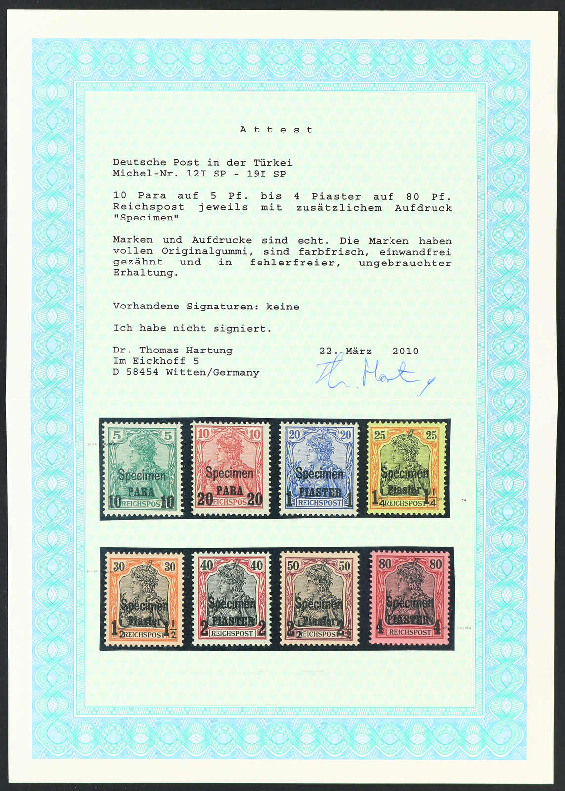 1900/01, 10 PA auf 5 Pfg. bis 4 PIA auf 80 Pfg. Aufdruckausgabe, zusammen acht Werte (alle Pfennigwerte der Urmarken) mit Aufdruck "Specimen", ungebraucht, einwandfrei, unsigniert, Fotoexpertise Dr. Hartung (ME 1.440,-) (Image) (imagea)