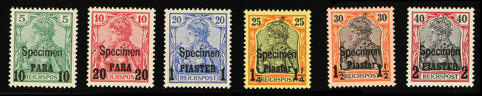 1900/01, 10 PA auf 5 Pfg. bis 4 PIA auf 80 Pfg. Aufdruckausgabe, zusammen acht Werte (alle Pfennigwerte der Urmarken) mit Aufdruck "Specimen", postfrisch, einwandfrei, 40 und 50 Pfg. sign. Grobe, sonst unsigniert, Fotoexpertise Dr.