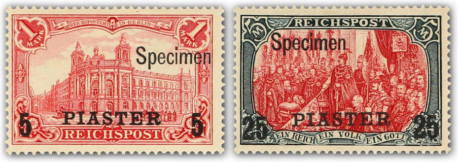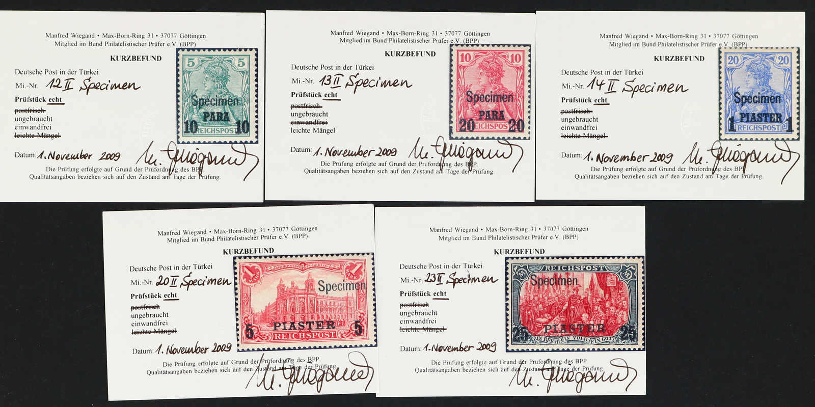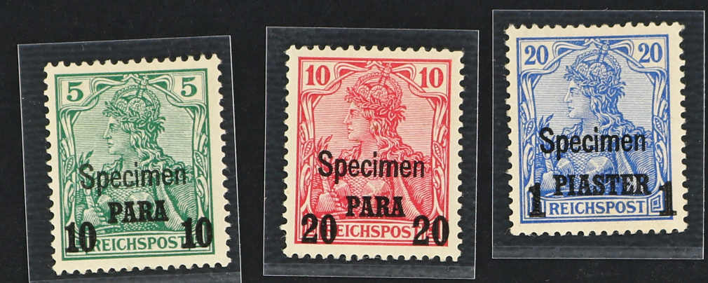 1902/04, 10 PA auf 5 Pfg. (dunkel)grün bis 25 PIA auf 5 M. grünschwarz/bräunlichkarmin, Aufdruck-A ohne Serifen, der komplette Satz von fünf Werten mit Aufdruck "Specimen" (die 10 PIA auf 2 M. gibt es nicht mit diesem Aufdruck),