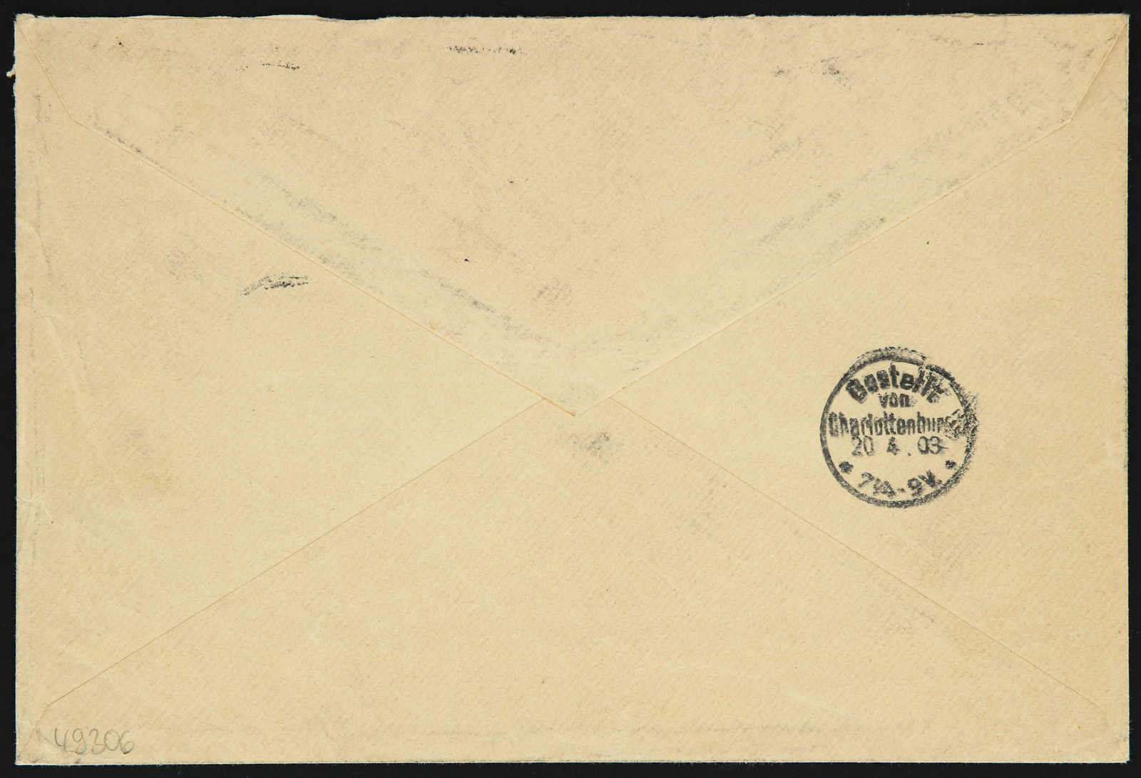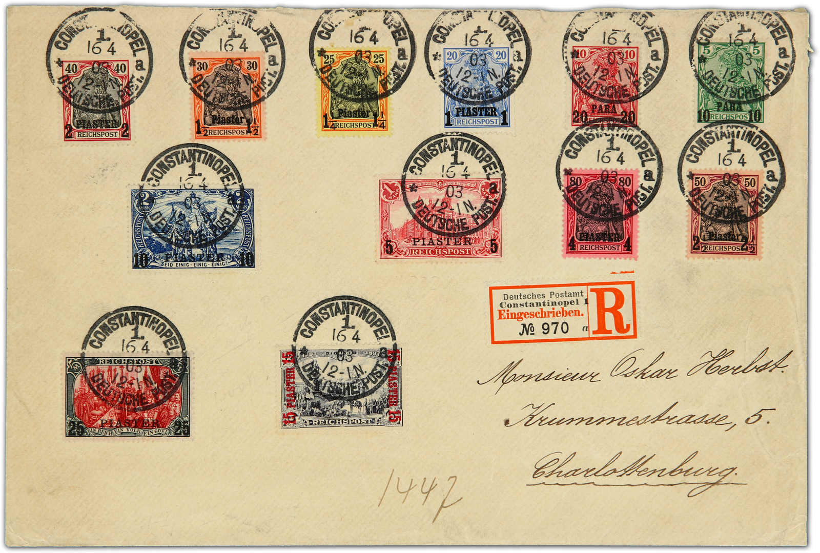 1903, 10 Pa. auf 5 Pfg. bis 25 Pia. auf 5 M. Germania, die kpl. Ausgabe auf Satzbrief, als Einschreiben aufgegeben "CONSTANTINOPEL 1. a DEUTSCHE POST 16 4 03", adressiert nach Charlottenburg, rücks. Ankunftsstp. vom 20.4.03, seltener