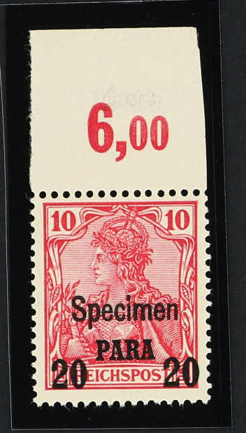 1904, 20 PA auf 10 Pfg. Aufdruckausgabe dunkelkarminrot, Aufdruck-A oben mit Serifen, mit Aufdruck "Specimen", postfrisches Exemplar vom Oberrand, einwandfrei, unsigniert, Fotobefund Jäschke-Lantelme BPP (ME 350,-+) (Image) (imagea)