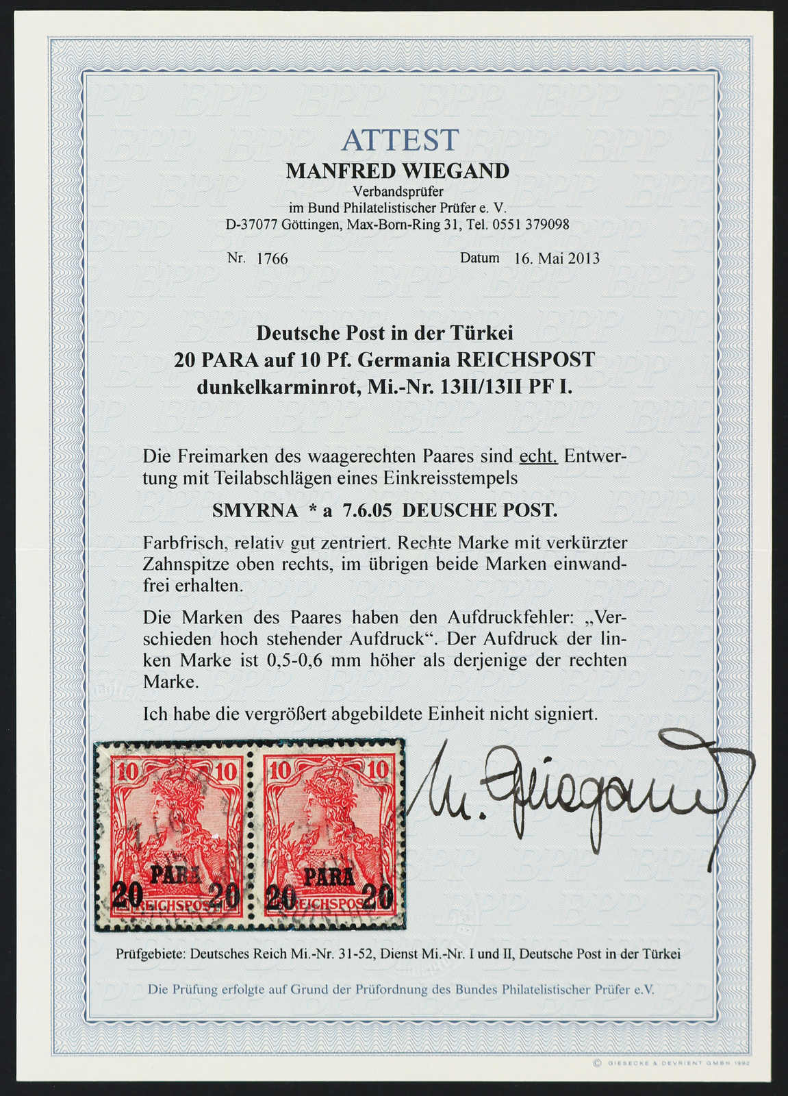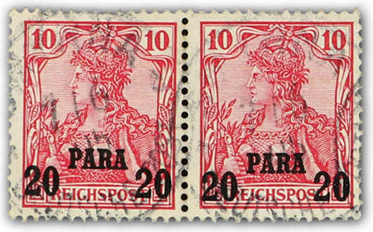 1904, 20 PA auf 10 Pfg. Aufdruckausgabe dunkelkarminrot, Aufdruck-A oben mit Serifen, waagerechtes Paar mit verschieden hoch stehendem Aufdruck, gestempelt "SMYRNA * a DEUTSCHE POST 7.6.05", rechte Marke verkürzte Zahnspitze oben rechts,
