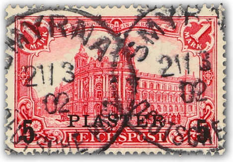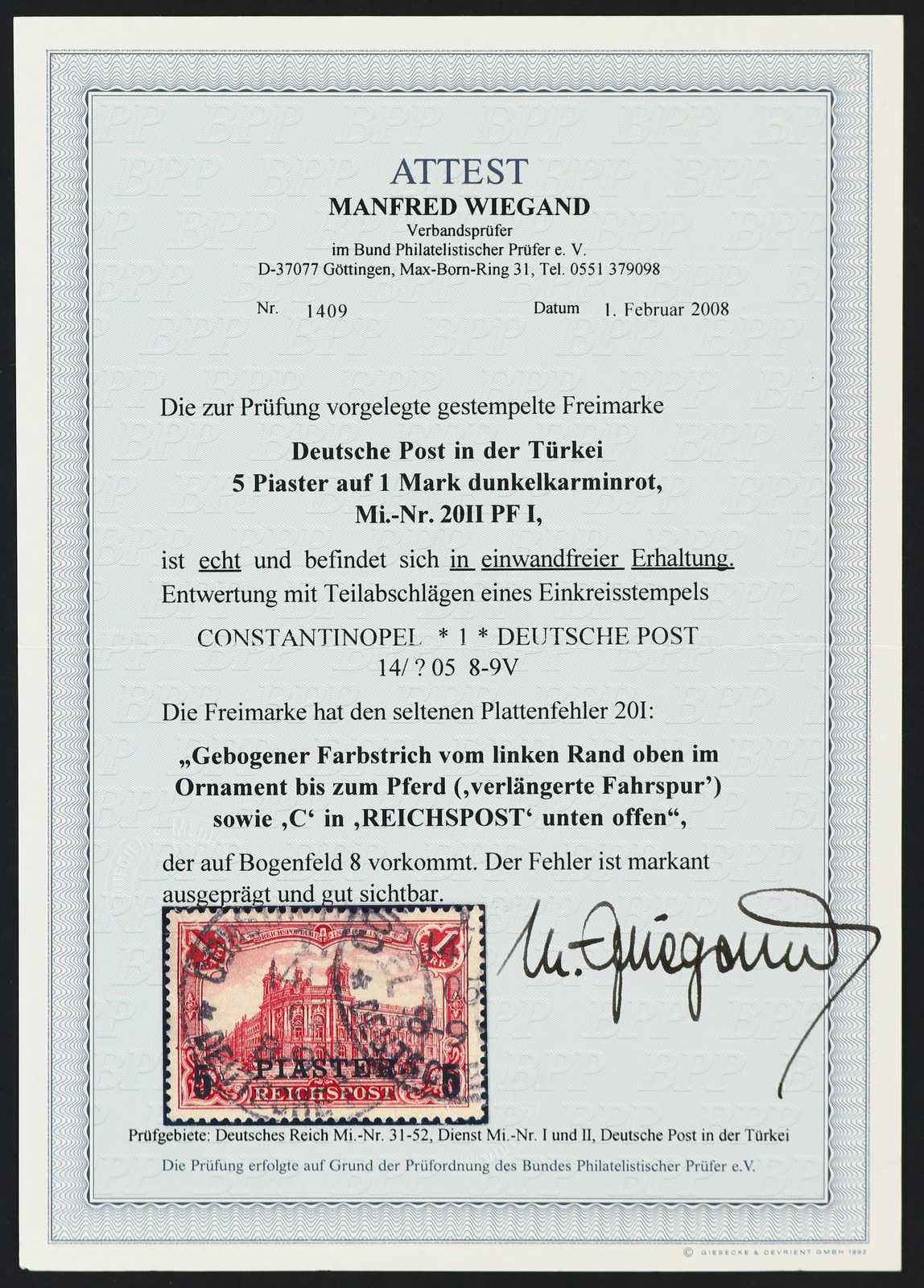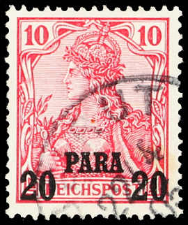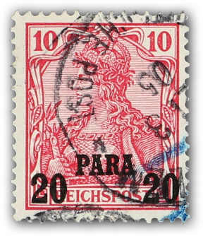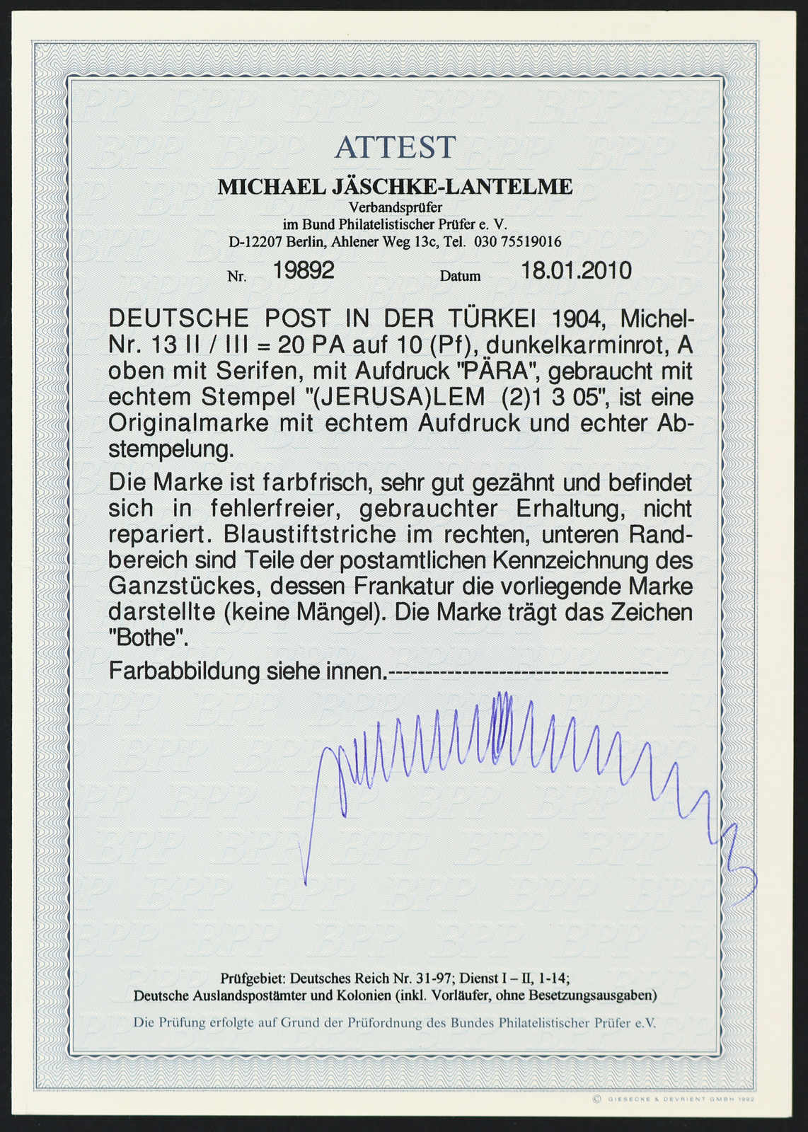 1904, 20 PA auf 10 Pfg. Aufdruckausgabe dunkelkarminrot, Aufdruck-A oben mit Serifen, mit Aufdruckfehler "PÄRA", gestempelt "(JERUSA)LEM (2)1 3 05", farbfrisch, einwandfrei, Blaustiftstriche im unteren rechten Bereich sind Teile der