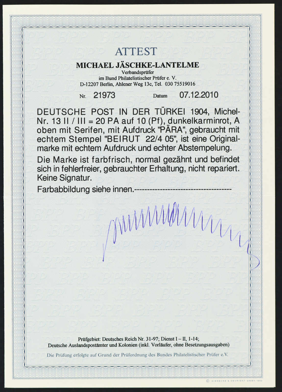1904, 20 PA auf 10 Pfg. Aufdruckausgabe dunkelkarminrot, Aufdruck-A oben mit Serifen, mit Aufdruckfehler "PÄRA", gestempelt "BEIRUT 22/4 05", farbfrisch, einwandfrei, Fotoattest Jäschke-Lantelme BPP (ME 1.000,-) (Image) (imagea)