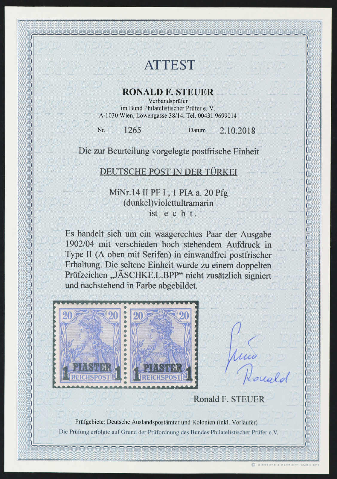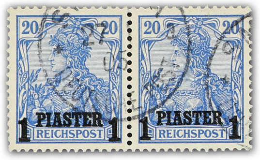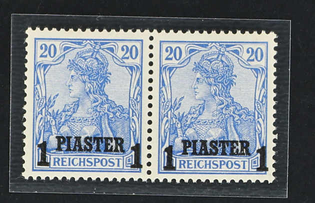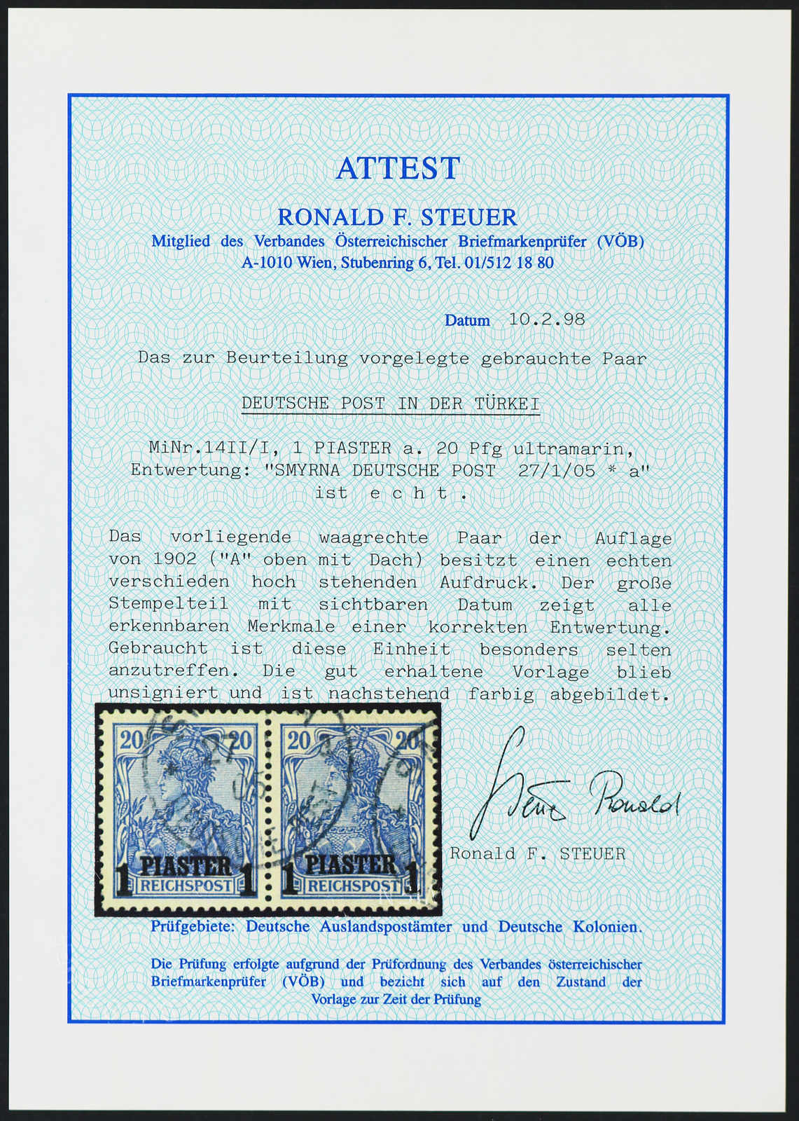 1902, 1 PIA auf 20 Pfg. Aufdruckausgabe ultramarin, Aufdruck-A oben mit Serifen, waagerechtes Paar mit verschieden hoch stehendem Aufdruck, gestempelt "S(MYRNA) * DEUTSCHE POST a 27/1 05", sehr gute Qualität, Fotoattest Steuer VÖB
