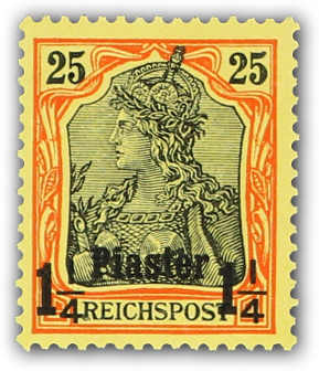 1900, 1¼ Pia auf 25 Pfg. Aufdruckausgabe rötlichorange/gelbschwarz auf hellgelb, Aufdrucktype I, mit Plattenfehler "Anstrich des R in REICHSPOST unten gespalten (Klumpfuß)", postfrisch, einwandfrei, Fotoattest Jäschke-Lantelme BPP (ME