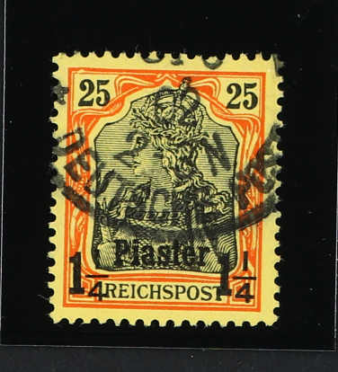1900, 1¼ Pia auf 25 Pfg. Aufdruckausgabe rötlichorange/gelbschwarz auf hellgelb, Aufdruck Type I, mit Plattenfehler "blasenförmiger weißer Fleck zwischen den Randlinien oben links", gestempelt, einwandfrei, Fotobefund Jäschke-Lantelme BPP
