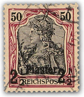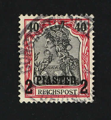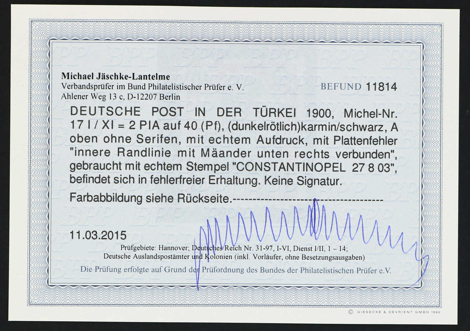 1900, 2 PIA auf 40 Pfg. Aufdruckausgabe (dunkelrötlich)karmin/schwarz, Aufdruck-A oben ohne Serifen, mit Plattenfehler "innere Randlinie mit Mäander unten rechts verbunden", klar gestempelt "CONSTANTINOPEL 27 8 03", einwandfrei,