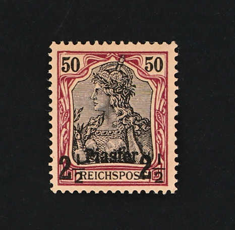 1900, 2½ Pia auf 50 Pfg. Aufdruckausgabe dunkelbräunlichlila/rotschwarz auf mattbraunorange, Aufdruck Type I, mit Plattenfehler "blasenförmiger weißer Fleck zwischen den Randlinien oben links", ungebraucht, heller Zahn rechts, Fotobefund