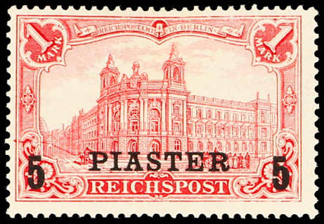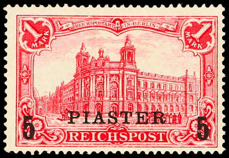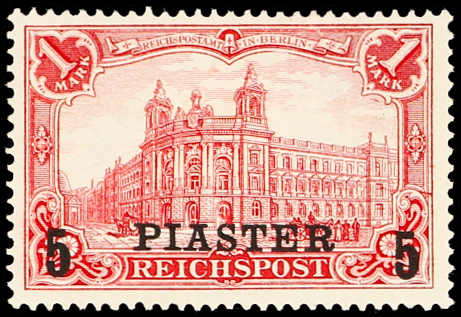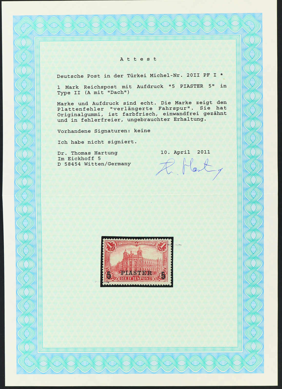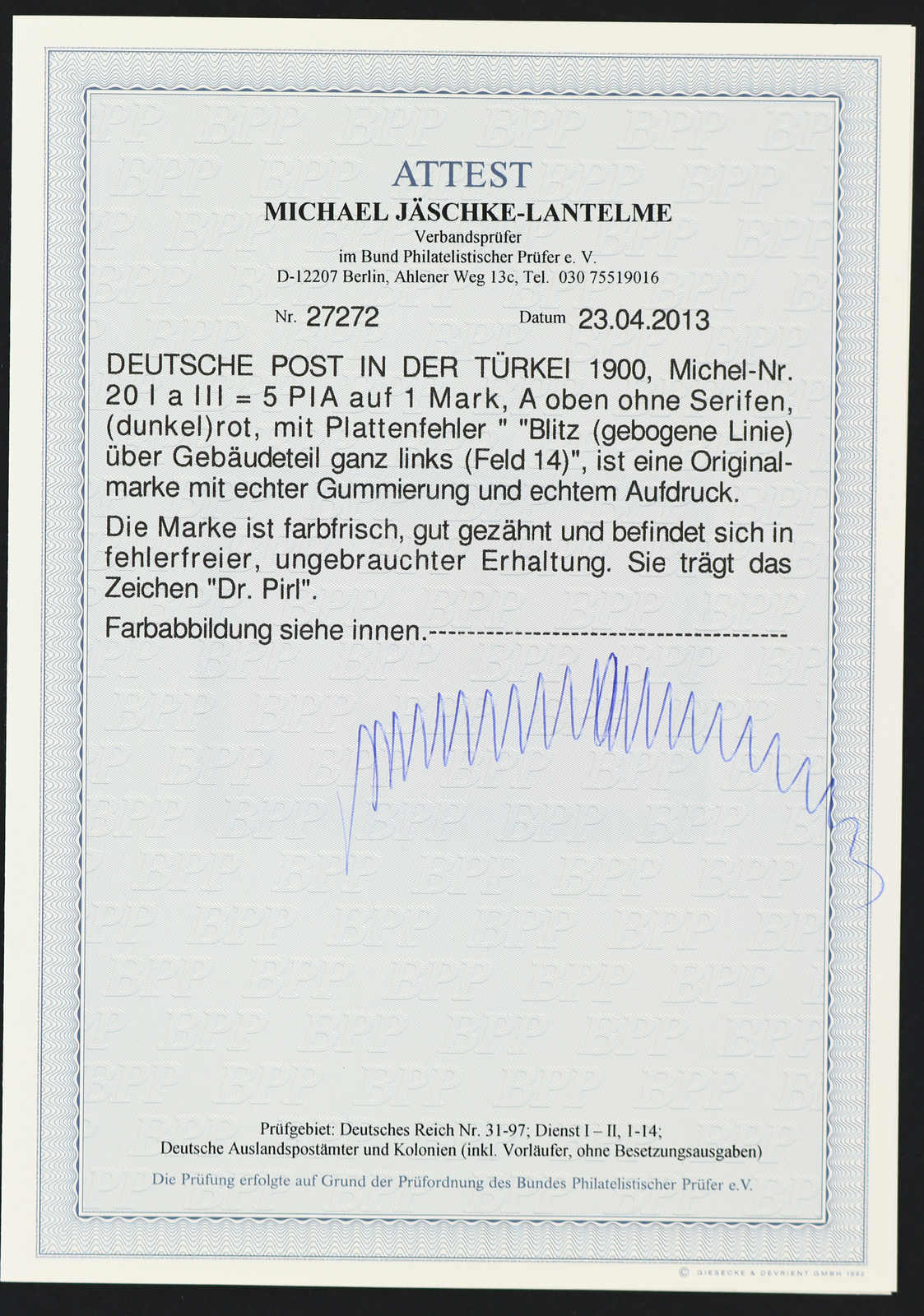 1900, 5 PIA auf 1 M. Aufdruckausgabe (dunkel)rot, Aufdruck-A oben ohne Serifen, mit Plattenfehler "Blitz (gebogene Linie) über Gebäudeteil ganz links", ungebraucht, einwandfrei, signiert Dr. Pirl, Fotoattest Jäschke-Lantelme BPP (ME