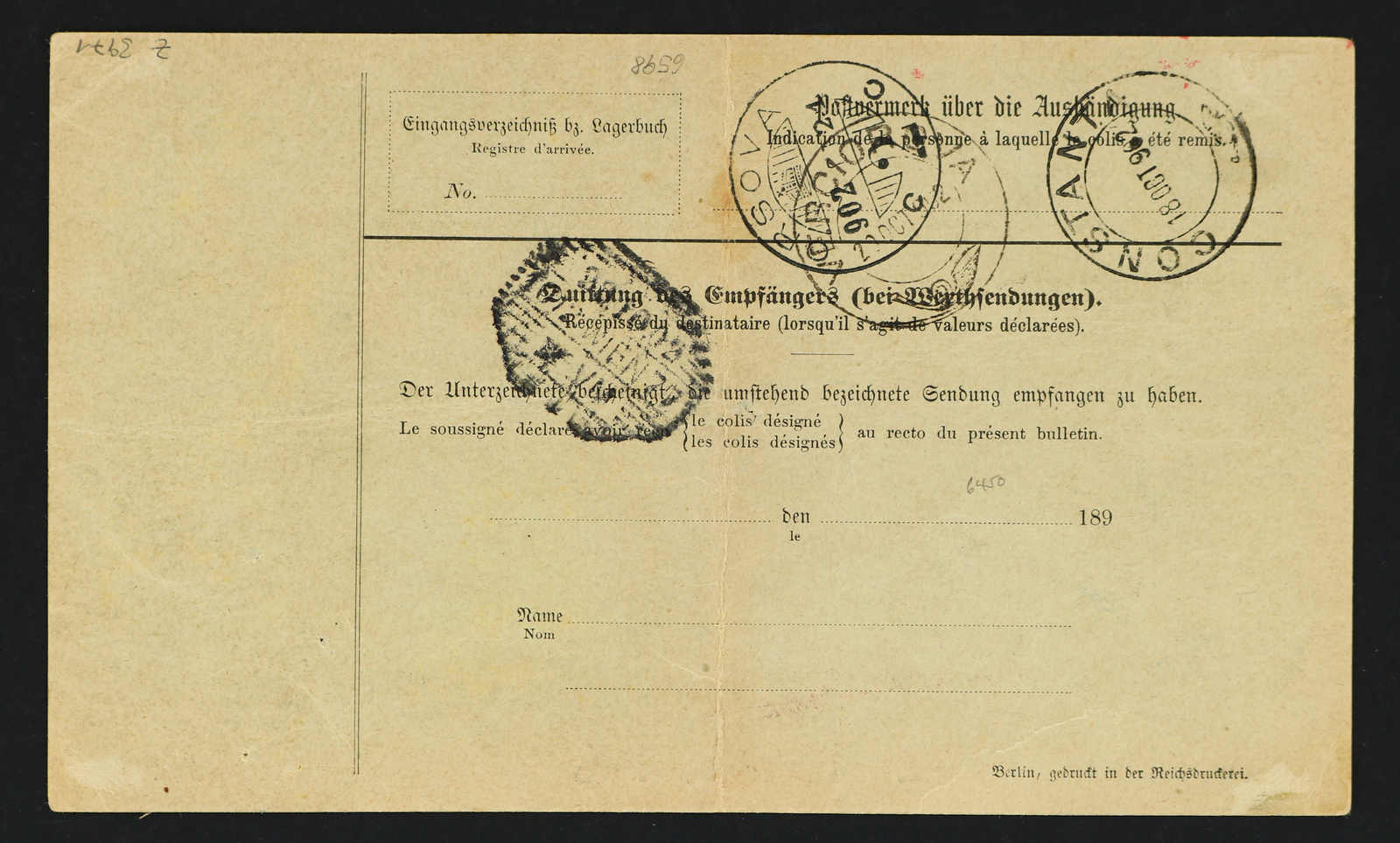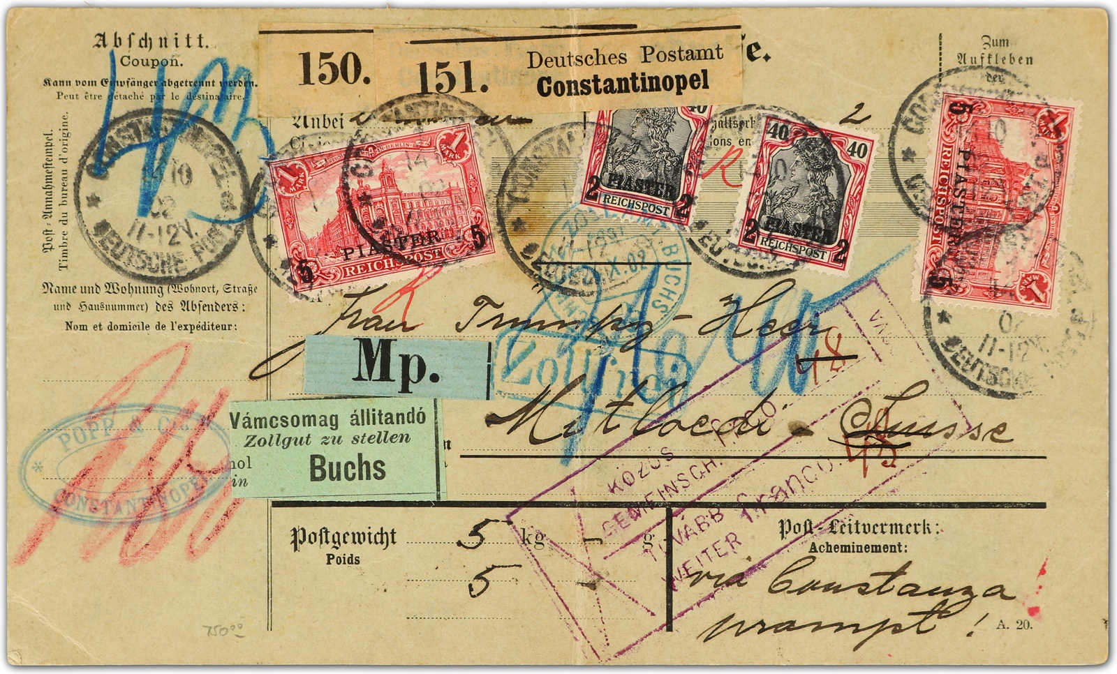 1902, 5 P. auf 1 M. dunkelzinnoberrot (2 Einzelwerte) und 2 P. auf 40 Pfg. dunkelrötlichkarmin/schwarz (2 Einzelwerte), auf Paketkarte für 2 Pakete, aufgegeben "CONSTANTINOPEL 1 DEUTSCHE POST 14.10.02", adressiert in die Schweiz,