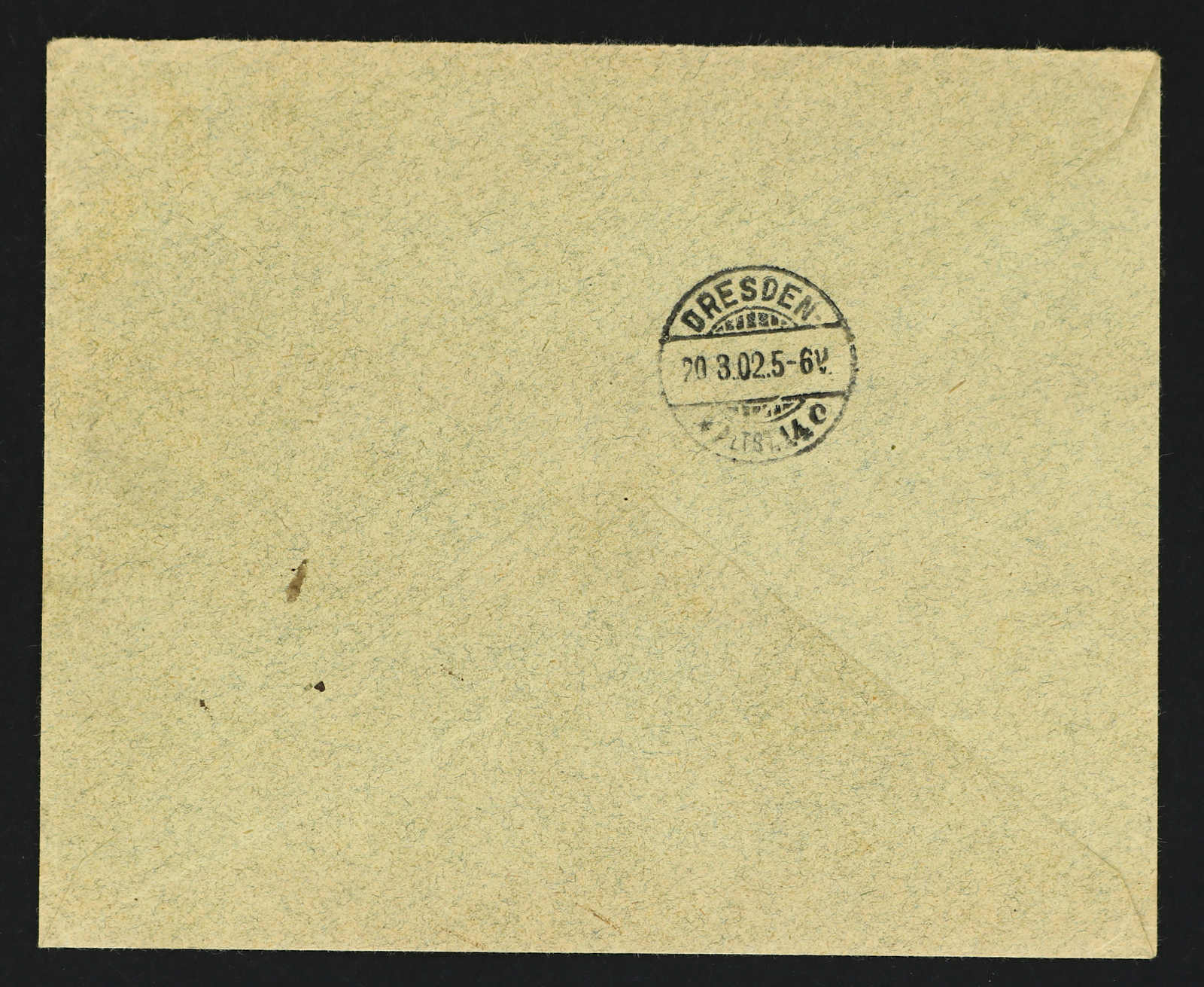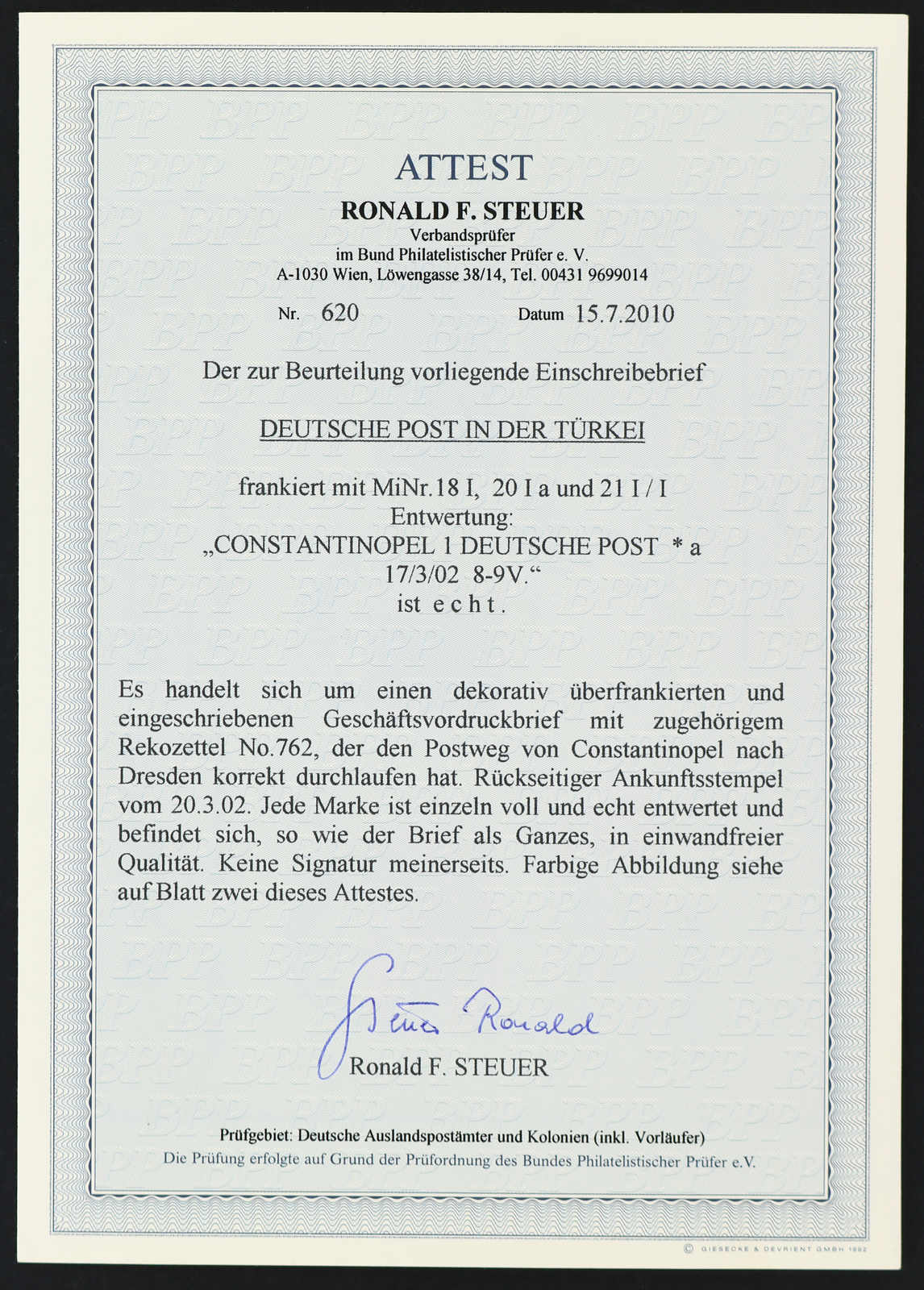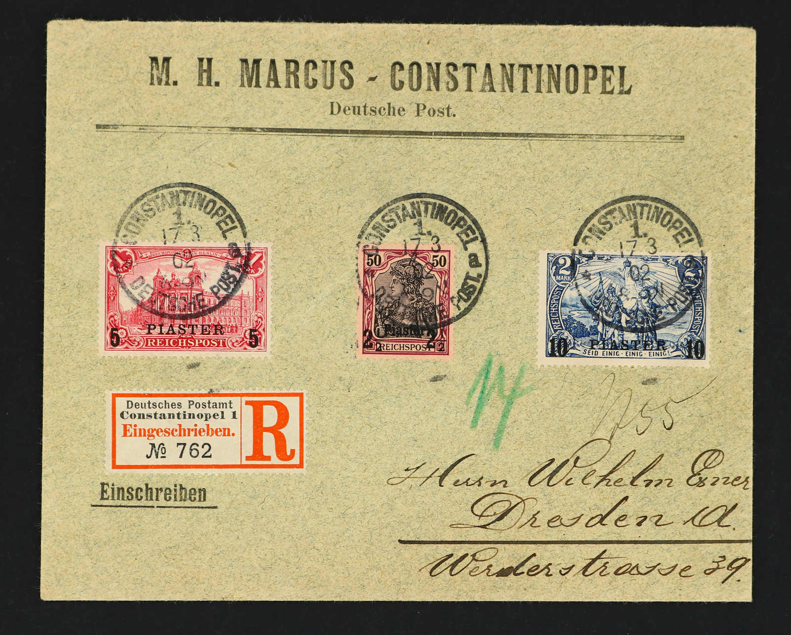 1902, 2½ PIA auf 50 Pfg. mit 5 PIA auf 1 M. und 10 PIA auf 2 M. (Urmarke Type I) Aufdruckausgabe auf überfrankiertem R-Geschäftsvordruckbrief mit glasklaren Entwertungen "CONSTANTINOPEL 1 * DEUTSCHE POST a 17 3 02" nach Dresden mit