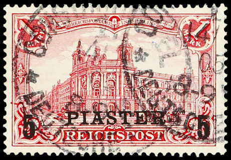 1900, 5 PIA auf 1 M. Aufdruckausgabe (dunkel)rot, Aufdruck-A oben ohne Serifen, mit Plattenfehler "Blitz (gebogene Linie) über Gebäudeteil ganz links", klar gestempelt "SMYRNA 21/3 02", farbfrisch, einwandfrei, Fotoattest Jäschke-Lantelme