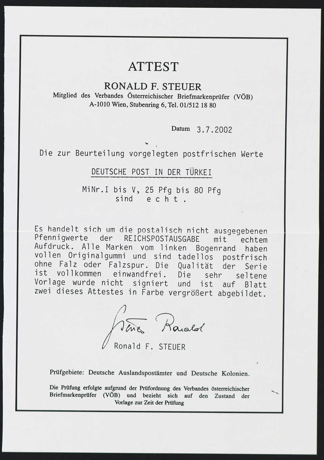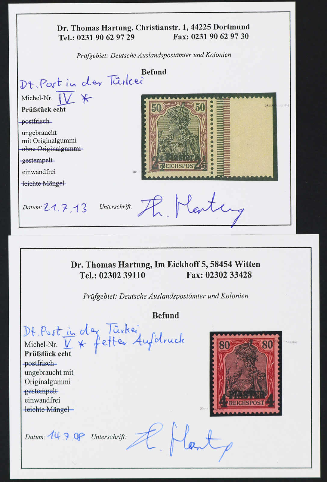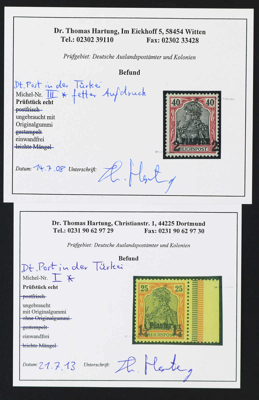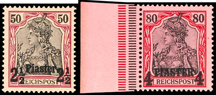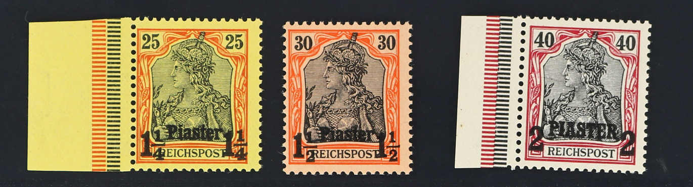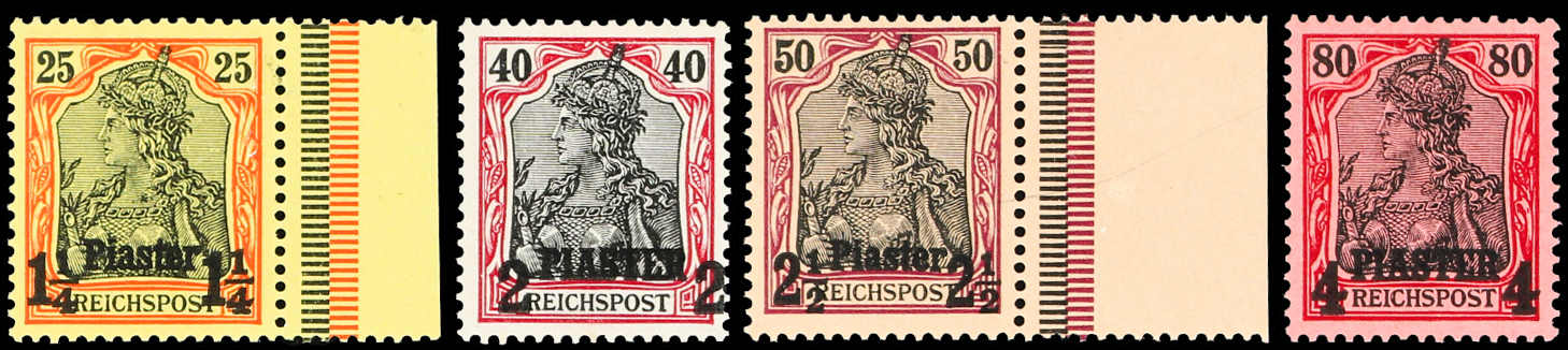 1902, 1¼ PIA auf 25 Pfg., 2 PIA auf 40 Pfg., 2½ PIA auf 50 Pfg. und 4 PIA auf 80 Pfg., vier nicht verausgabte Werte mit abweichender Aufdrucktype bzw. Aufdruck-A oben mit Serifen, ungebraucht, einwandfrei, je Kurzbefund Dr. Hartung (ME