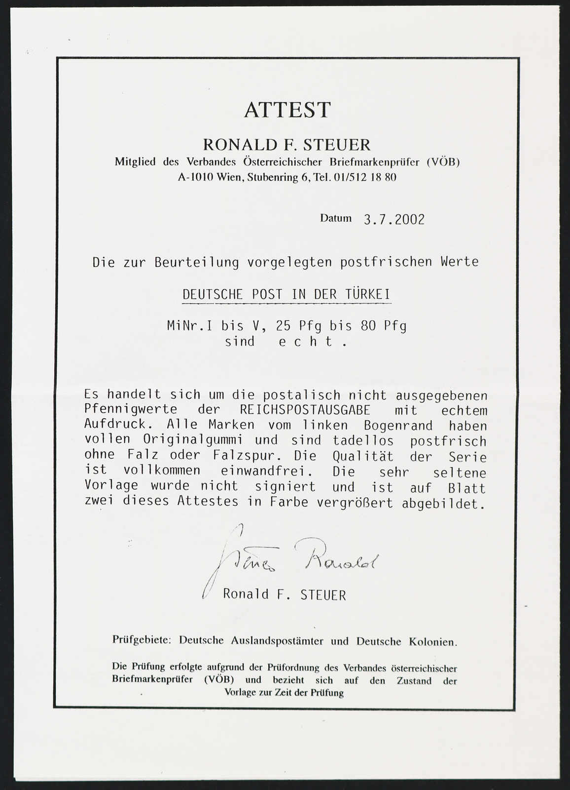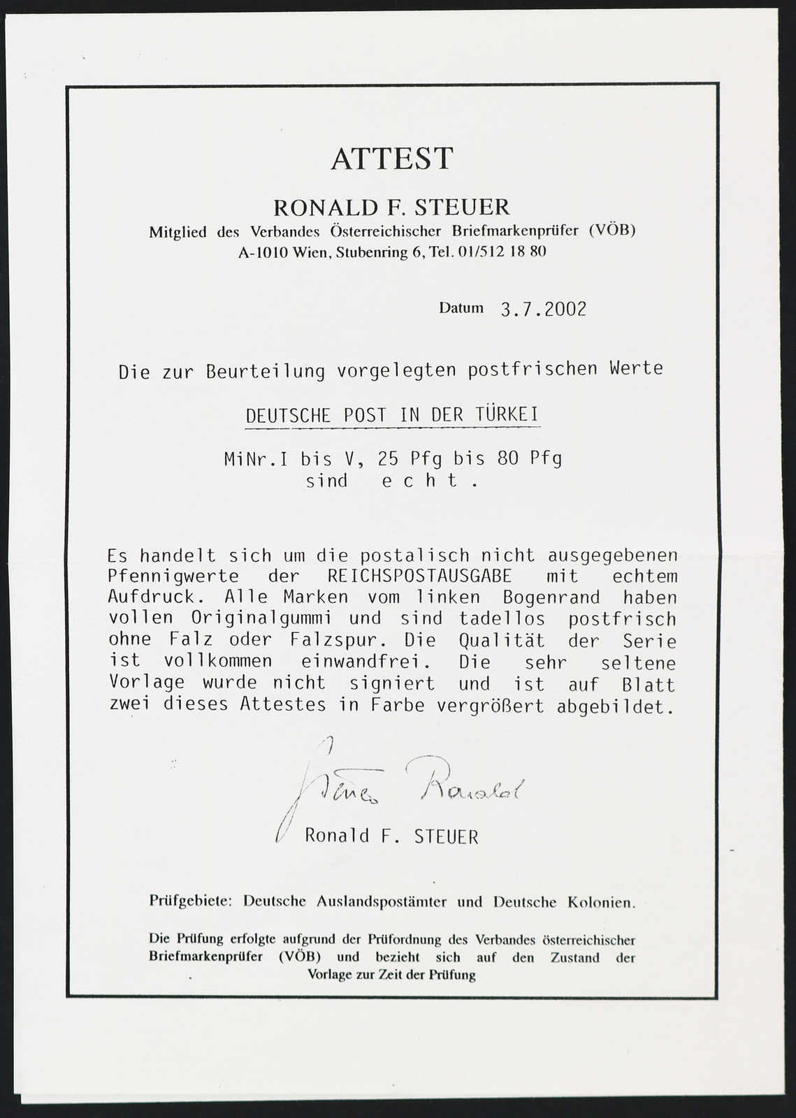 1902, 1¼ PIA auf 25 Pfg. bis 4 PIA auf 80 Pfg., fünf nicht verausgabte Werte mit abweichender Aufdrucktype bzw. Aufdruck-A oben mit Serifen, postfrisch, teils vom Bogenrand, einwandfrei, Attestkopie Steuer VÖB bzw. Kurzmitteilungen Dr.