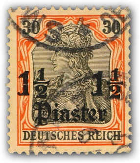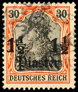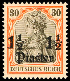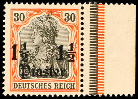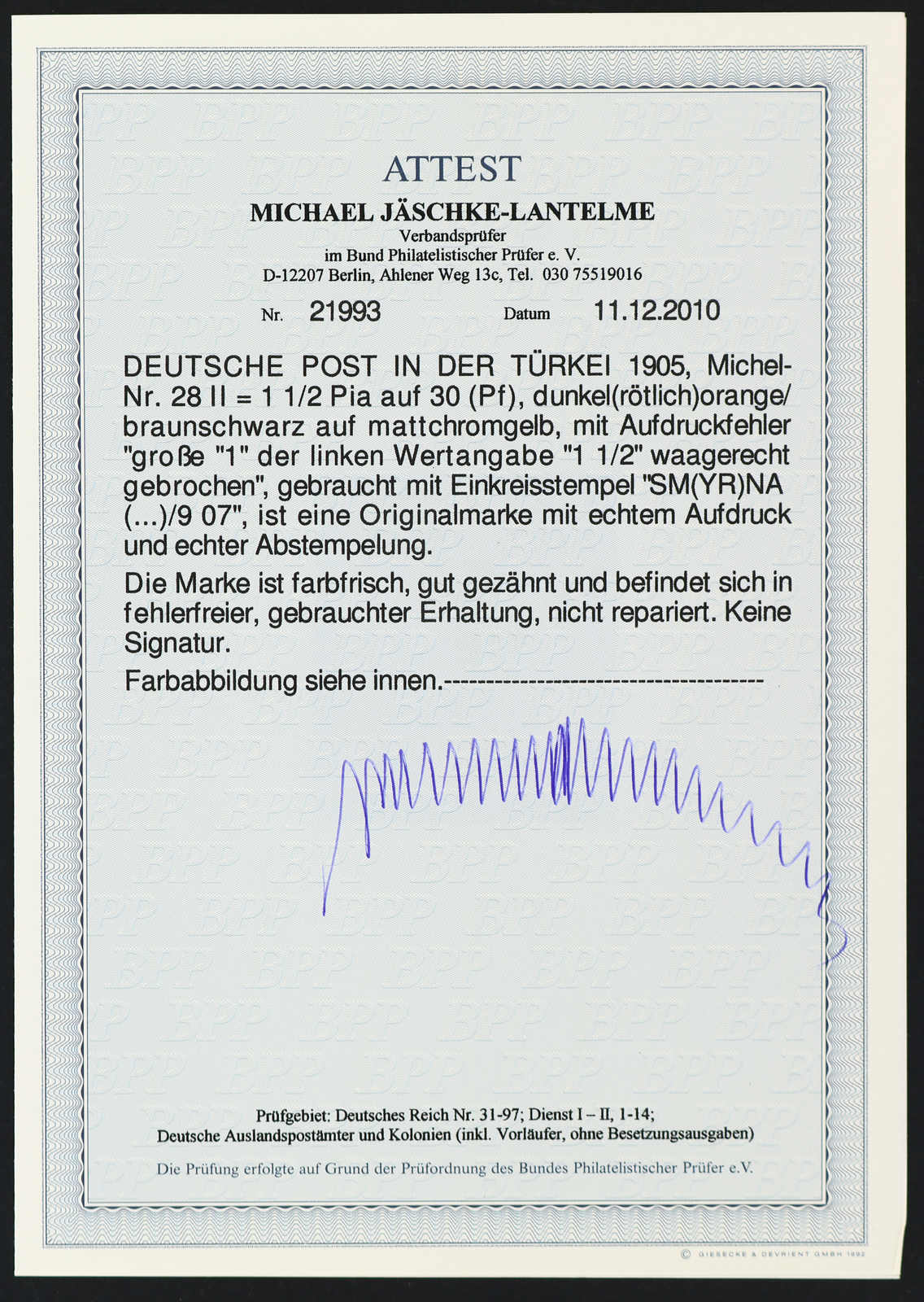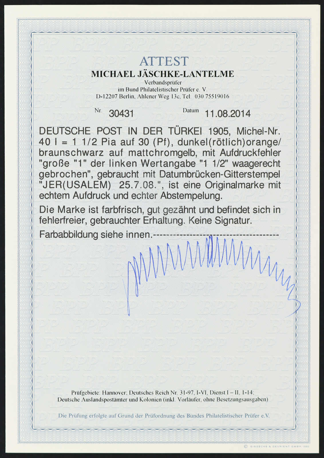1905, 1½ Pia auf 30 Pfg. Aufdruckausgabe dunkel(rötlich)orange/braunschwarz auf mattchromgelb, mit Aufdruckfehler "große 1 der linken Wertangabe 1½ waagerecht gebrochen", gestempelt "JER(USALEM) 25.7.08", farbfrisch, einwandfrei,