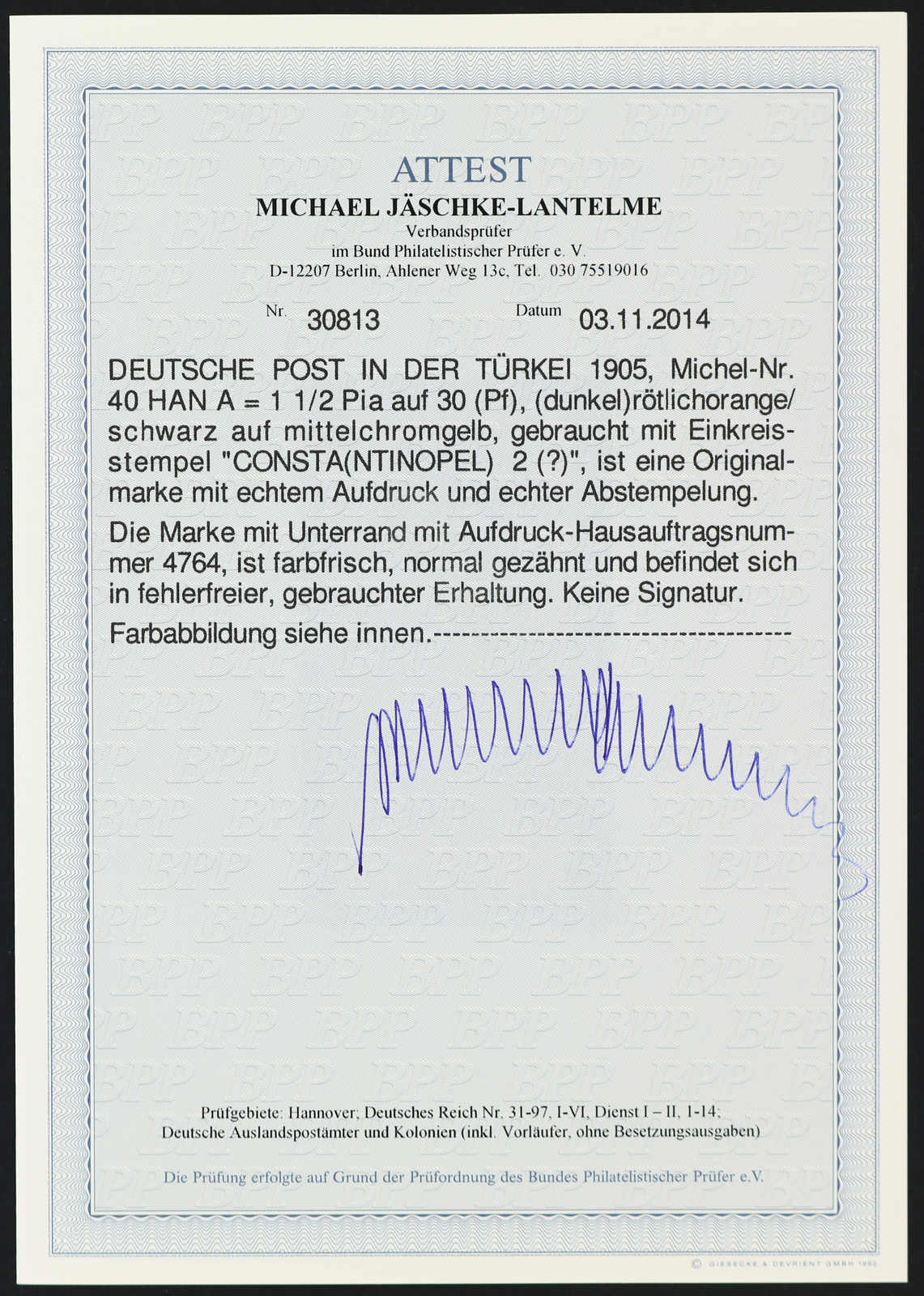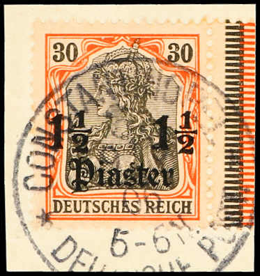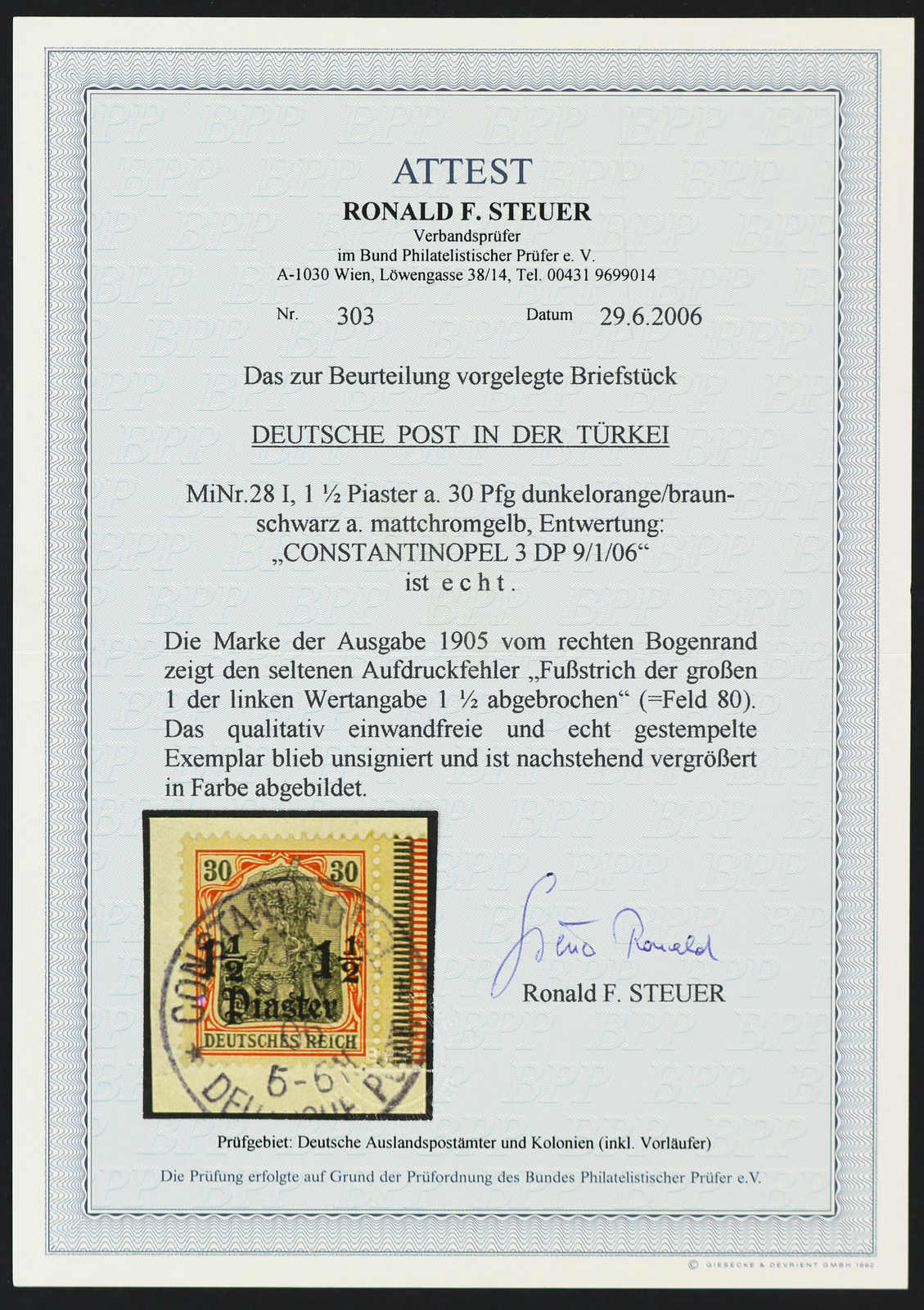1905, 1½ Pia auf 30 Pfg. Aufdruckausgabe dunkel(rötlich)orange/braunschwarz auf mattchromgelb, mit Aufdruckfehler "Fußstrich sowie Anstrich der großen 1 der linken Wertangabe 1½ abgebrochen", klar und zentrisch entwertet "CONSTANTINOPEL 3