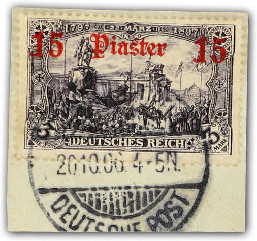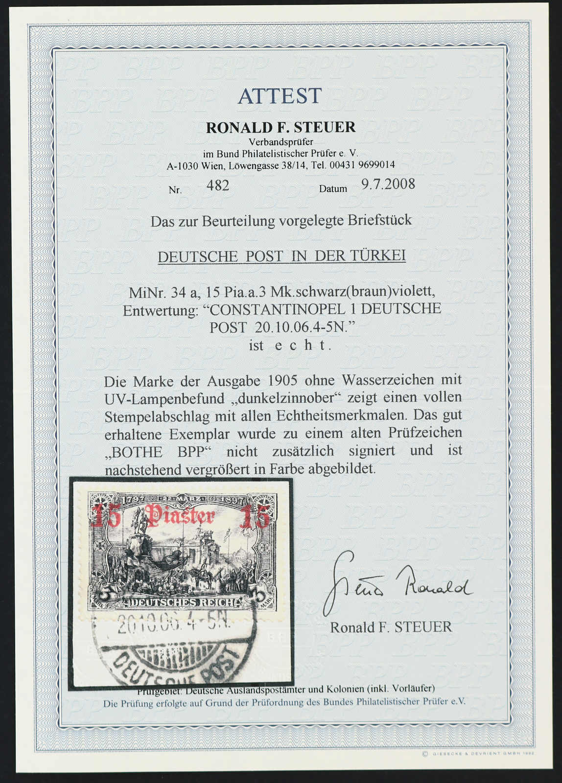 1905, 15 Pia auf 3 M. Aufdruckausgabe schwarz(braun)violett, dunkelzinnober quarzend, gestempelt "CONSTANTINOPEL 1 DEUTSCHE POST 20.10.06" auf Briefstück, einwandfrei, Fotoattest Steuer BPP (ME 600,-) (Image) (imagea)