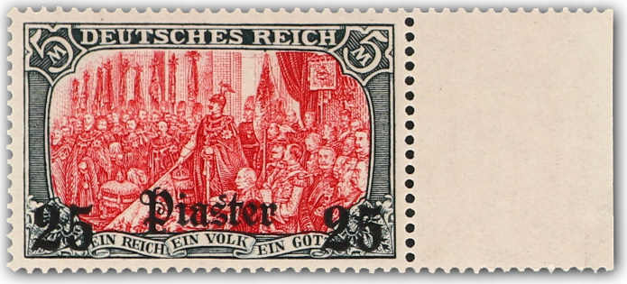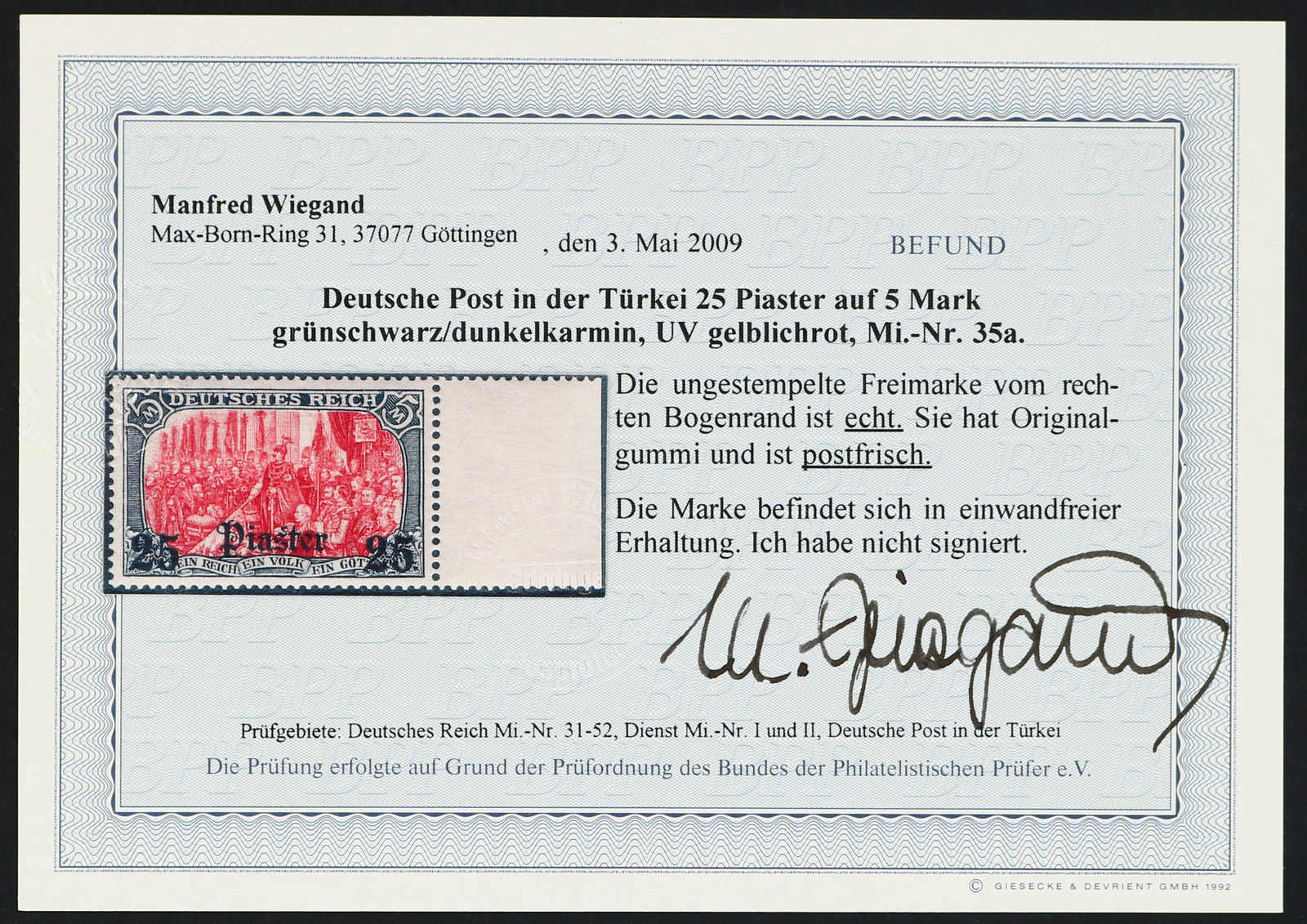 1905, 25 Pia. auf 5 M. Aufdruckausgabe grünschwarz/dunkelkarmin, gelblichrot quarzend, postfrisches Exemplar vom rechten Bogenrand, einwandfrei, Fotobefund Wiegand BPP (ME 650,-) (Image) (imagea)