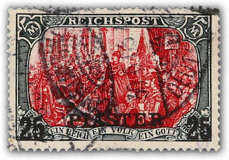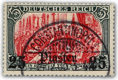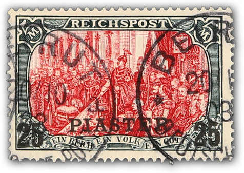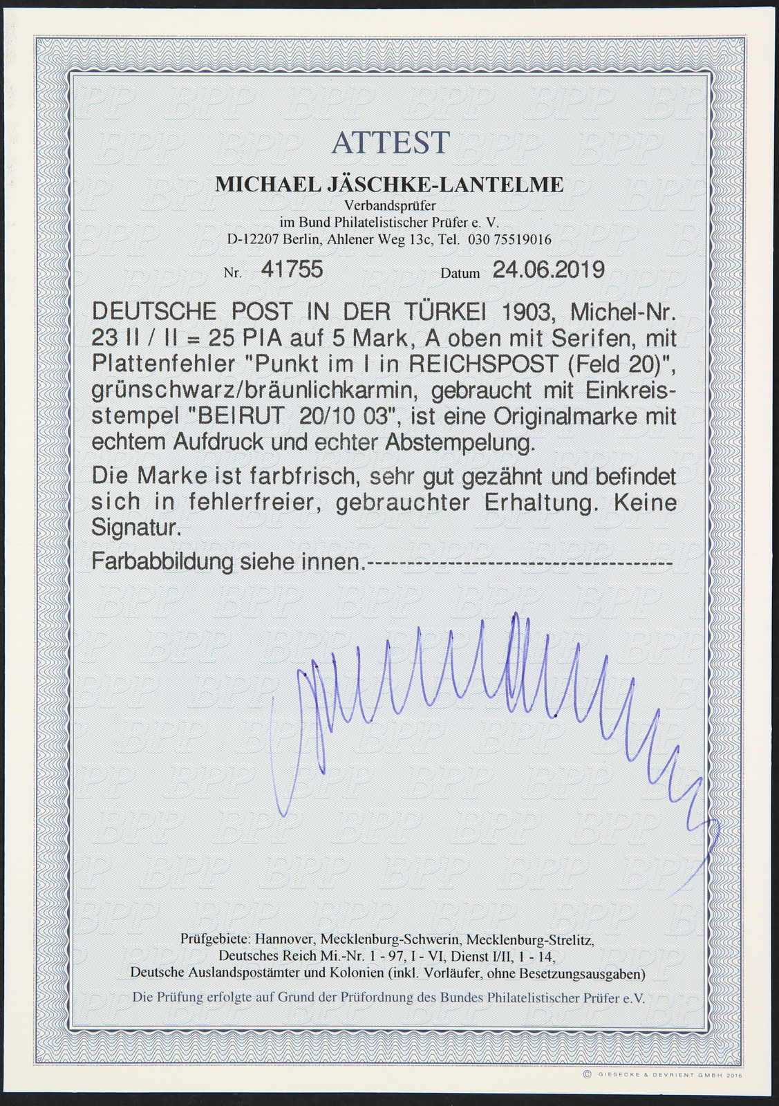 1903, 25 PIA auf 5 M. Aufdruckausgabe grünschwarz/bräunlichkarmin, mit Plattenfehler "Punkt im I von REICHSPOST", klar gestempelt "BEIRUT 20/10 03", farbfrisch und einwandfrei, Fotoattest Jäschke-Lantelme BPP (ME 3.000,-) (Image) (imagea)