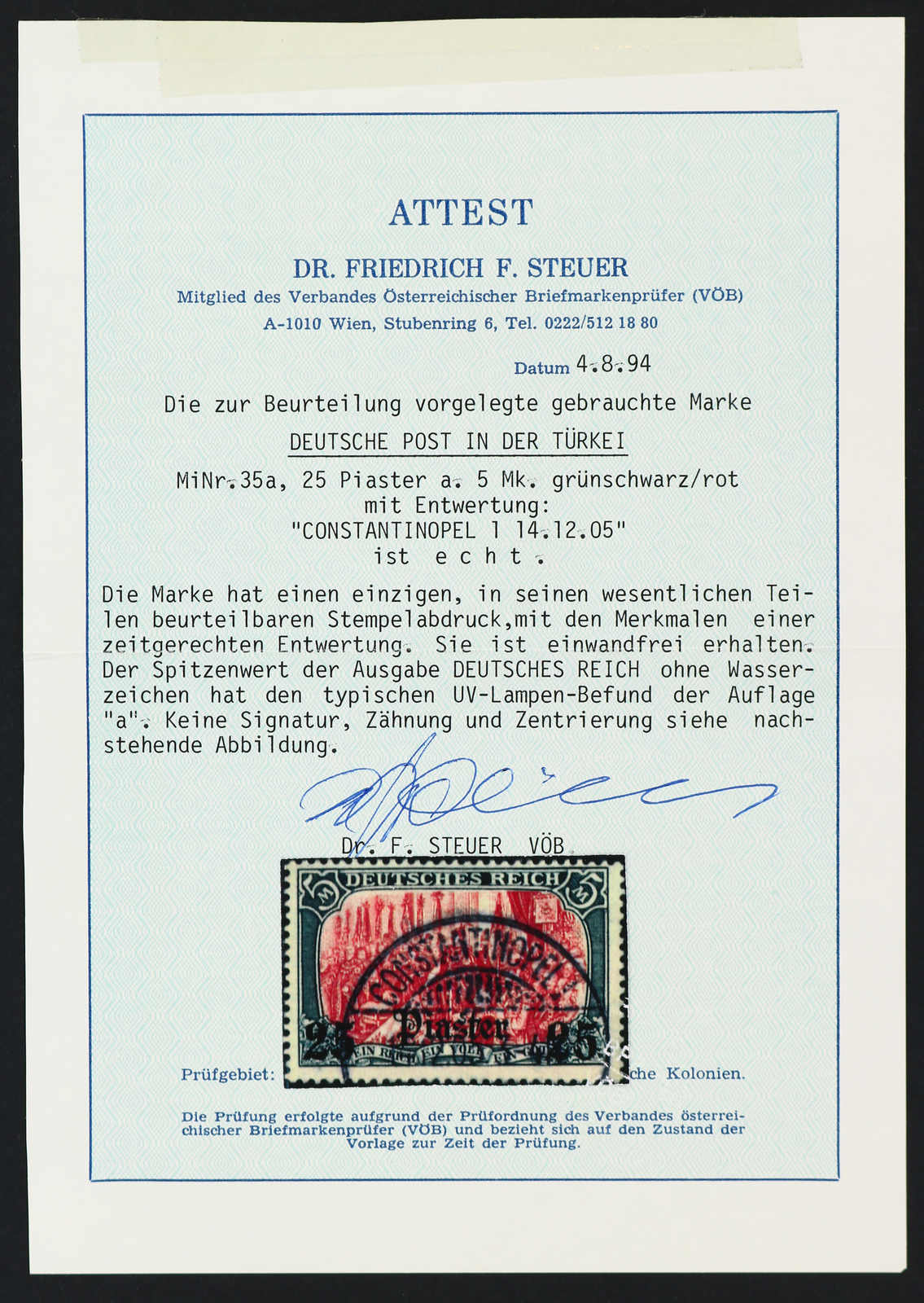1905, 25 Pia. auf 5 M. Aufdruckausgabe grünschwarz/dunkelkarmin, gelblichrot quarzend, klar gestempelt "CONSTANTINOPEL 1 14.12.05", einwandfrei, Fotoattest Steuer VÖB (ME 700,-) (Image) (imagea)