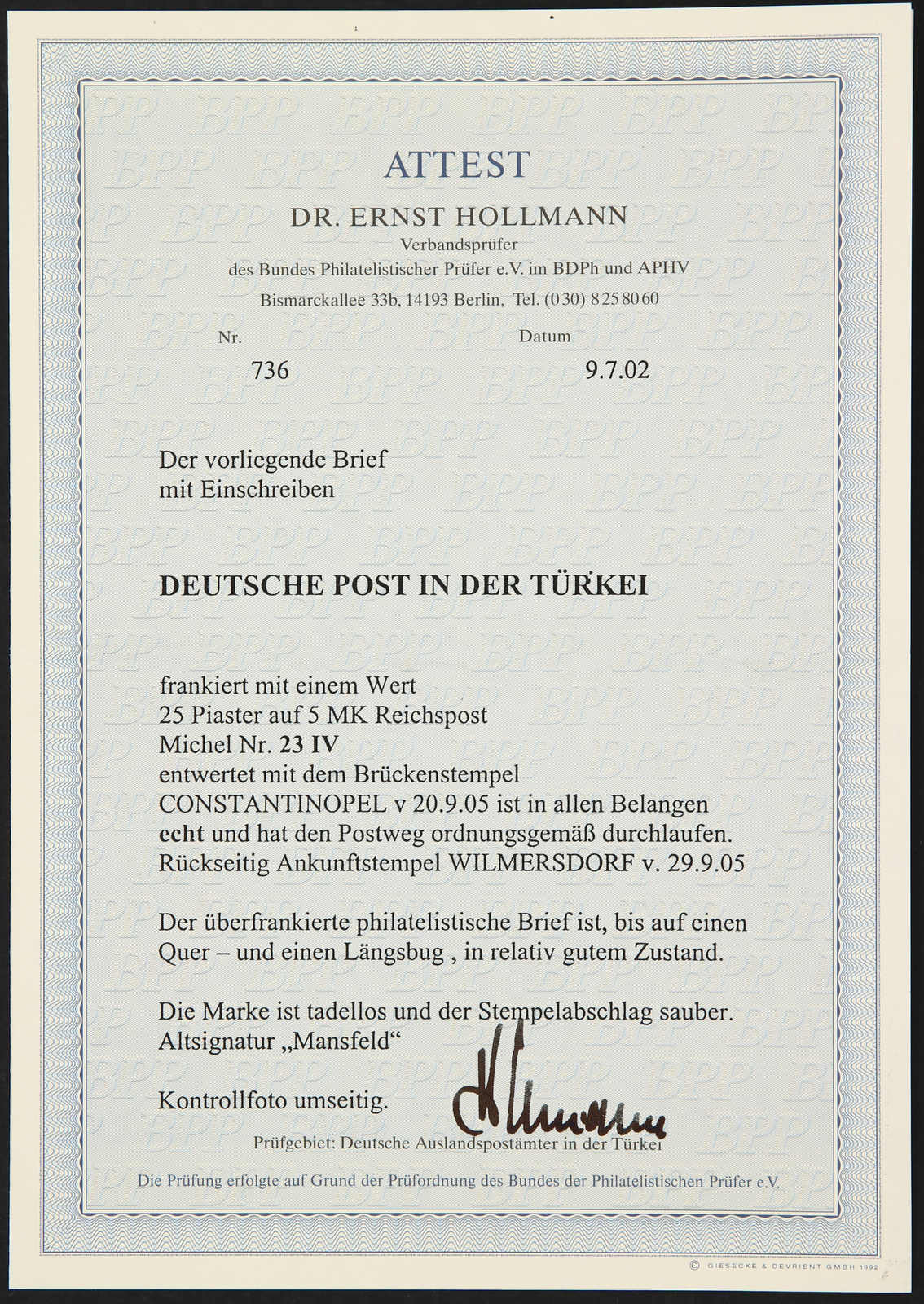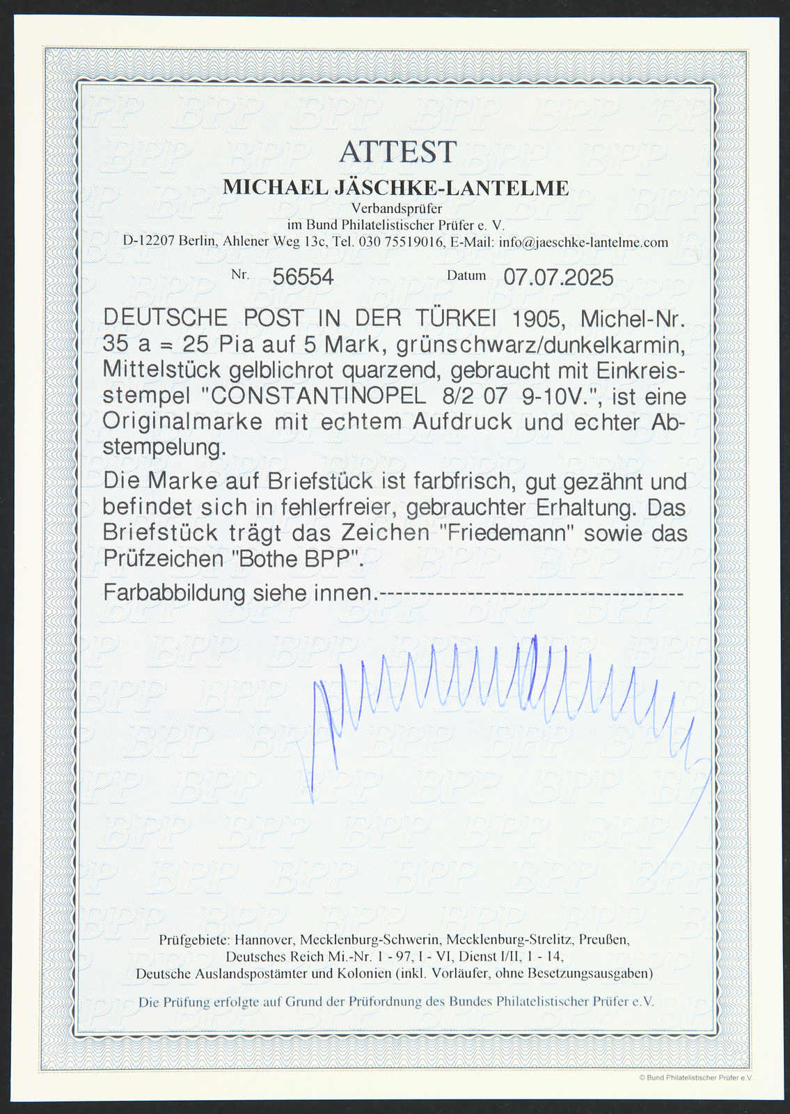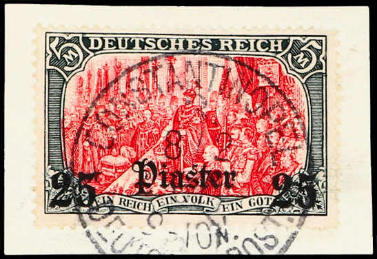 1905, 25 Pia. auf 5 M. Aufdruckausgabe grünschwarz/dunkelkarmin, karmin bis (bräunlich)lila quarzend, klar und zentrisch entwertet "CONSTANTINOPEL 3 8/2 07" auf Briefstück, einwandfrei, Fotoattest Steuer BPP (ME -,-) (Image) (imagea)