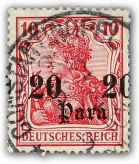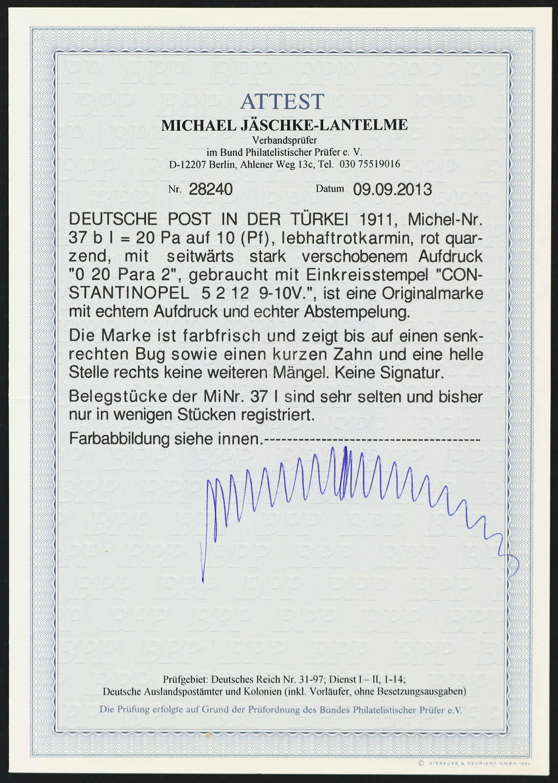 1911, 20 Pa auf 10 Pfg. Aufdruckausgabe lebhaftrotkarmin, rot quarzend, mit seitwärts stark verschobenem Aufdruck "0 20 Para 2, sauber gestempelt "CONSTANTINOPEL 5 2 12", senkrechter Bug, kurzer Zahn, helle Stelle, aufgrund der großen