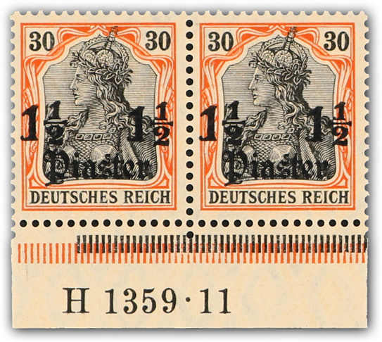 1905, 1¼ P. auf 30 Pfg. dunkelrötlichorange/schwarz auf mittelchromgelb, postfrisches waagerechtes Paar vom Unterrand mit der HAN H 1359.11, farbfrisch und gut gezähnt, einwandfrei (ME 450,-) (Image)