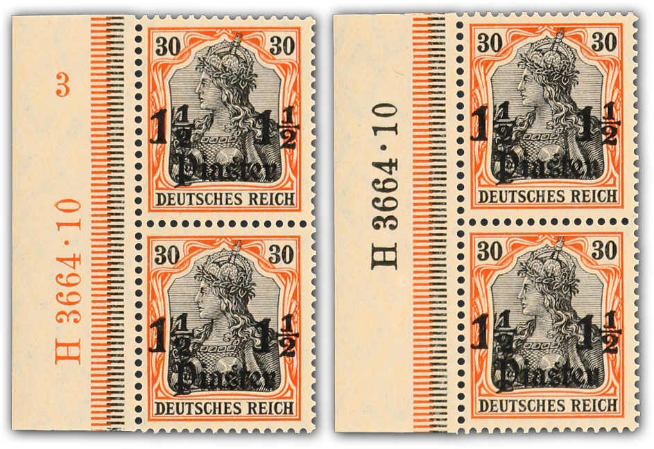1905, 1¼ P. auf 30 Pfg. dunkelrötlichorange/schwarz auf mittelchromgelb, zwei postfrische senkrechte Paare vom linken Bogenrand, je mit der HAN H 3664.10, dabei die HAN einmal schwarz und einmal rötlichorange, beide Paare farbfrisch und