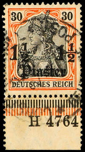 1905, 1½ Pia auf 30 Pfg. Aufdruckausgabe (dunkel)rötlichorange/schwarz auf mittelchromgelb, gestempeltes Exemplar vom Unterrand mit Aufdruck-HAN 4764, farbfrisch, einwandfrei, Fotoattest Jäschke-Lantelme BPP (ME -,-) (Image) (imagea)