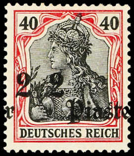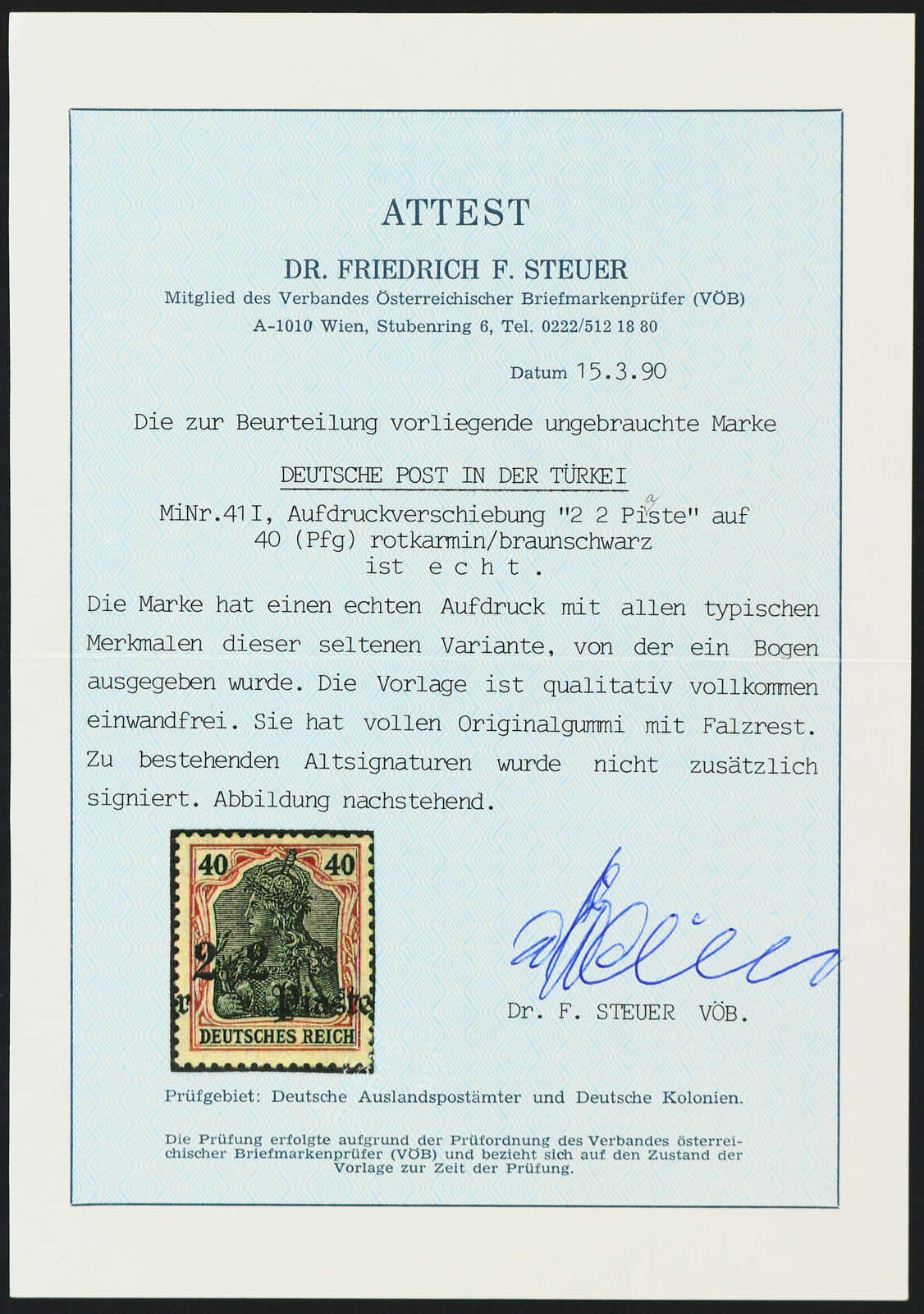 1905, 2 Pia auf 40 Pfg. Aufdruckausgabe rotkarmin/braunschwarz, mit seitwärts stark verschobenem Aufdruck "2 2 Piaste r", ungebraucht, einwandfrei, Fotoattest Steuer VÖB (ME 1.500,-) (Image) (imagea)