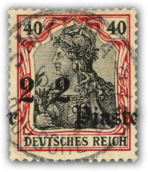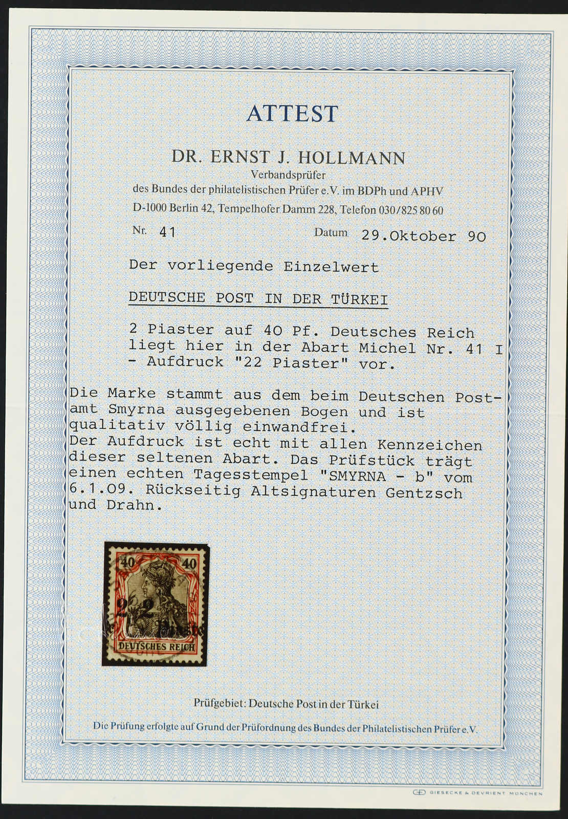 1905, 2 Pia auf 40 Pfg. Aufdruckausgabe rotkarmin/braunschwarz, mit seitwärts stark verschobenem Aufdruck "2 2 Piaste r", zentrisch entwertet "SMYRNA b 6.1.09", einwandfrei, signiert Gentzsch und Drahn, Fotoattest Hollmann BPP (ME