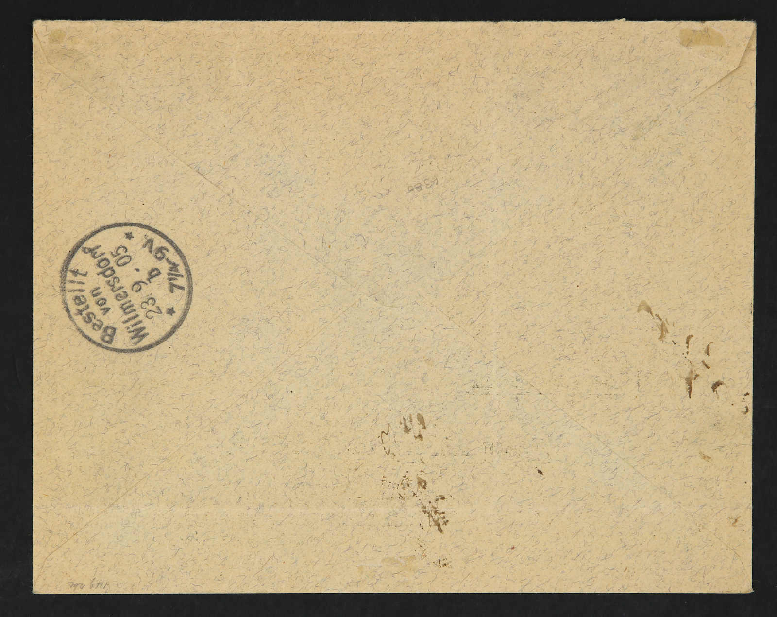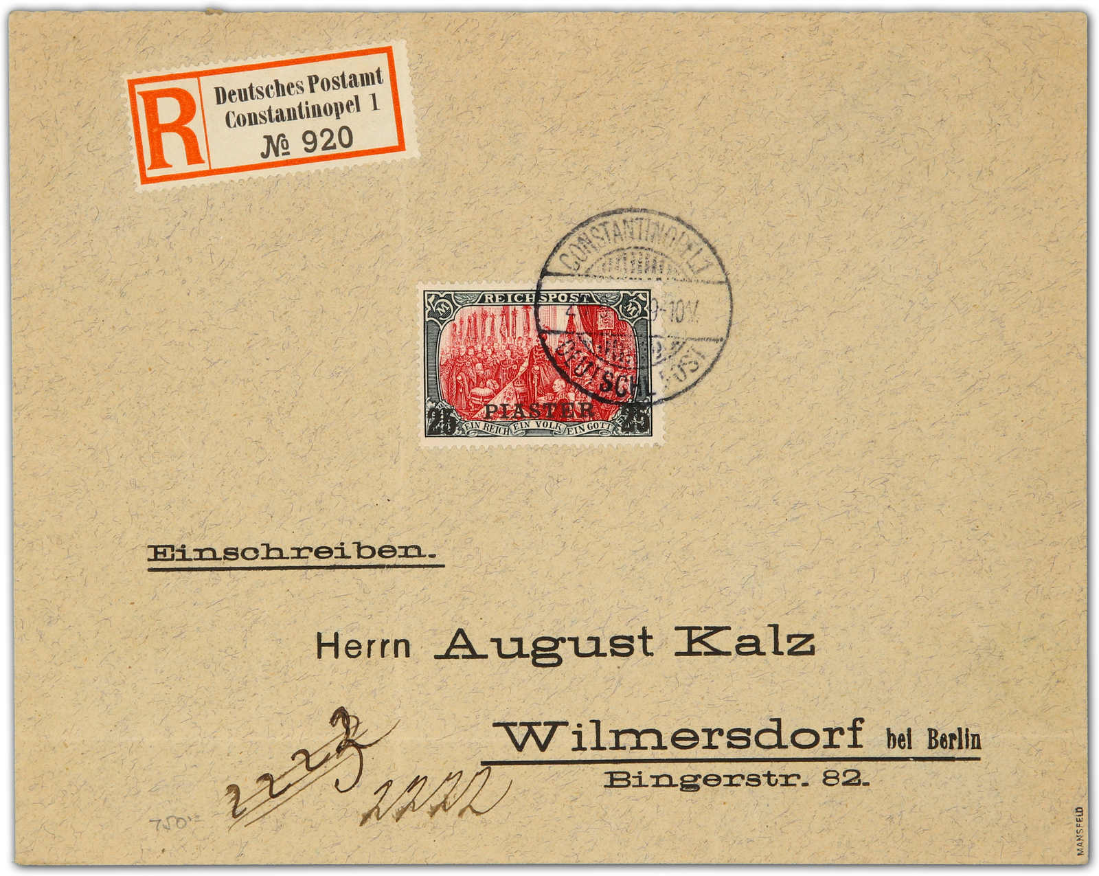 1903, 25 PIA auf 5 M. Aufdruckausgabe grünschwarz/bräunlichkarmin, Aufdruck-A oben mit Serifen, Type II, klar entwertet "CONSTANTINOPEL v 20.9.05" auf überfrankiertem R-Brief nach Wilmersdorf bei Berlin mit rückseitigem Ankunftsstempel,
