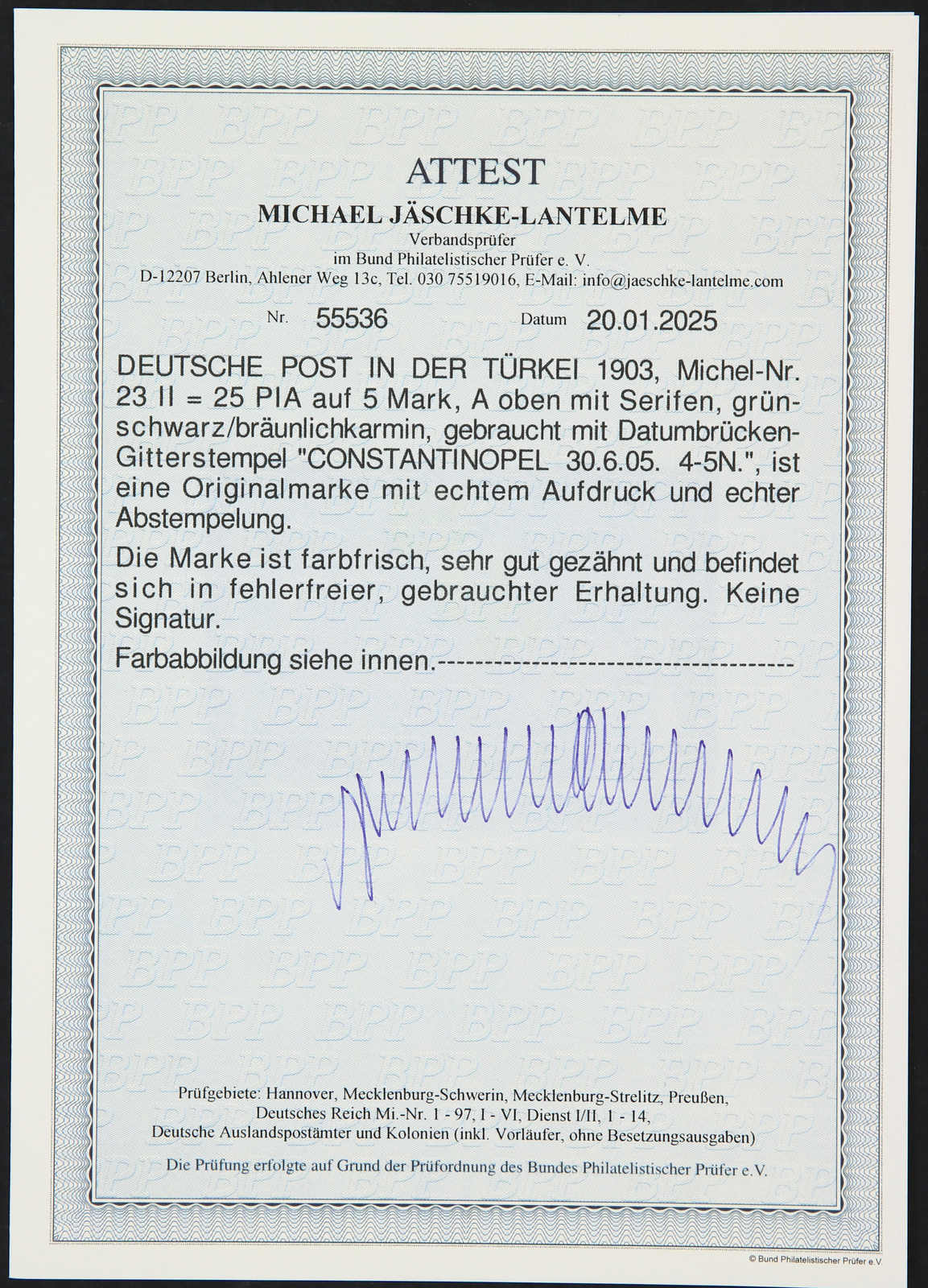 1903, 25 PIA auf 5 M. Aufdruckausgabe grünschwarz/bräunlichkarmin, Aufdruck-A oben mit Serifen, sauber gestempelt "CONSTANTINOPEL 30.6.05", farbfrisch und einwandfrei, Fotoattest Jäschke-Lantelme BPP 01/2025 (ME 700,-) (Image) (imagea)