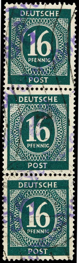 1948, 16 Pfg. Ziffern dunkelgrünblau, senkrechter Dreierstreifen mit Handstempelaufdruck "36 Fredersdorf", aus dem Bedarf mit Rollstempelentwertung von Fredersdorf, einwandfrei mit der für diese Ausgabe üblichen Zähnung, einer der großen