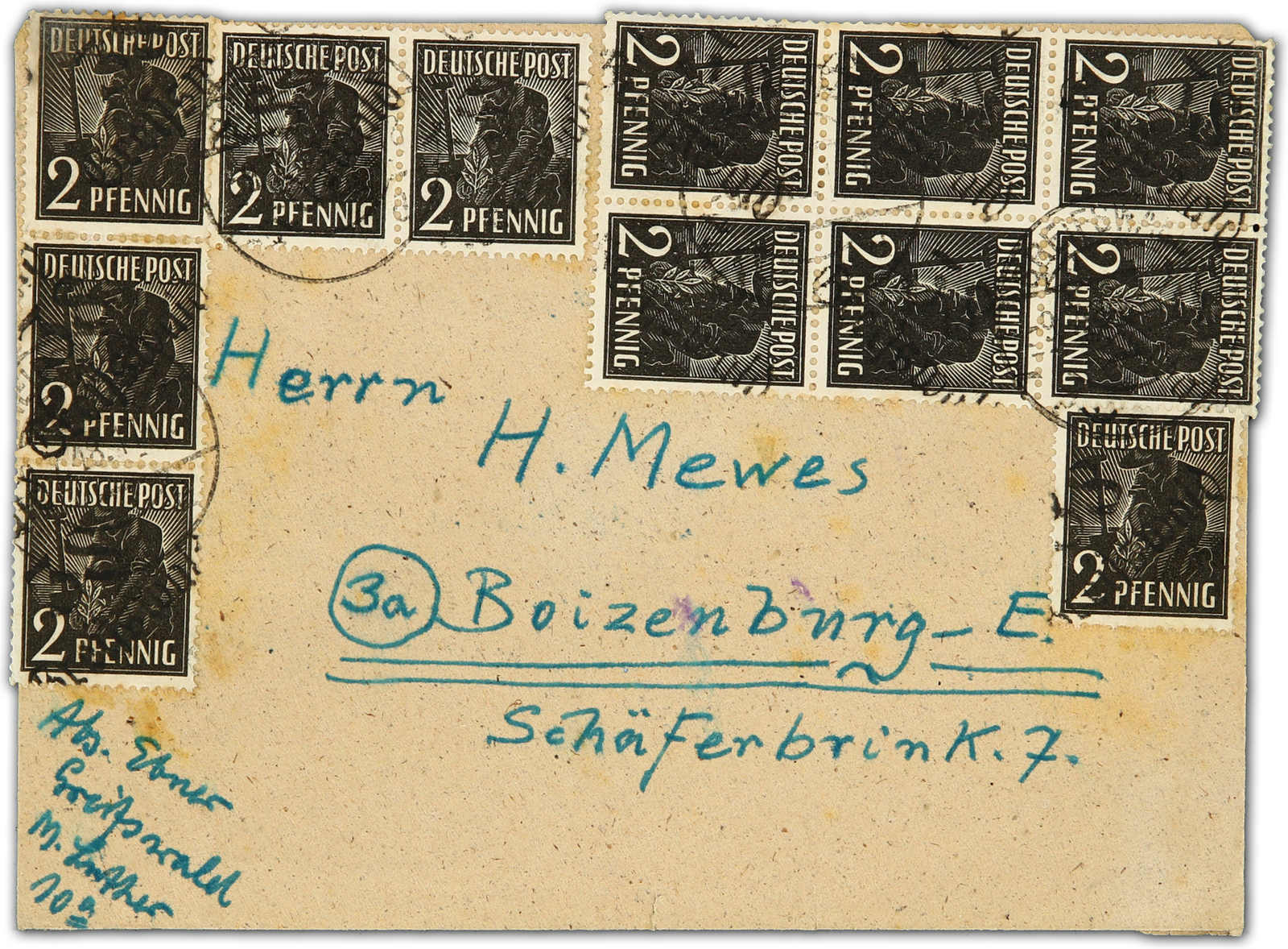 1948, 2 Pfg. Arbeiter mit Handstempelaufdruck "38 Greifswald" als Massenfrankatur von 12 Exemplaren auf portogerechtem Fernbrief, teilweise überstehend geklebt, dadurch teils gestaucht, kleinere Einschränkungen sind tolerierbar, da bisher