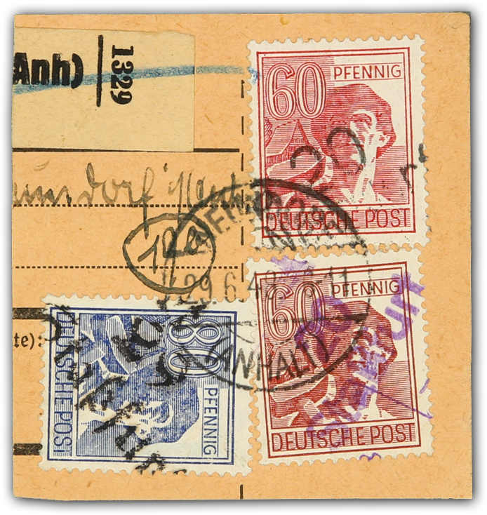 1948, 60 Pfg. Arbeiter hell und normal mit Handstempelaufdruck "20 (Neundorf) Staßfurt a" bzw. "20 Staßfurt" sowie 80 Pfg. Arbeiter mit Handstempelaufdruck "29 Staßfurt" zusammen auf Paketkartenabschnitt, einwandfrei, neben der Frankatur
