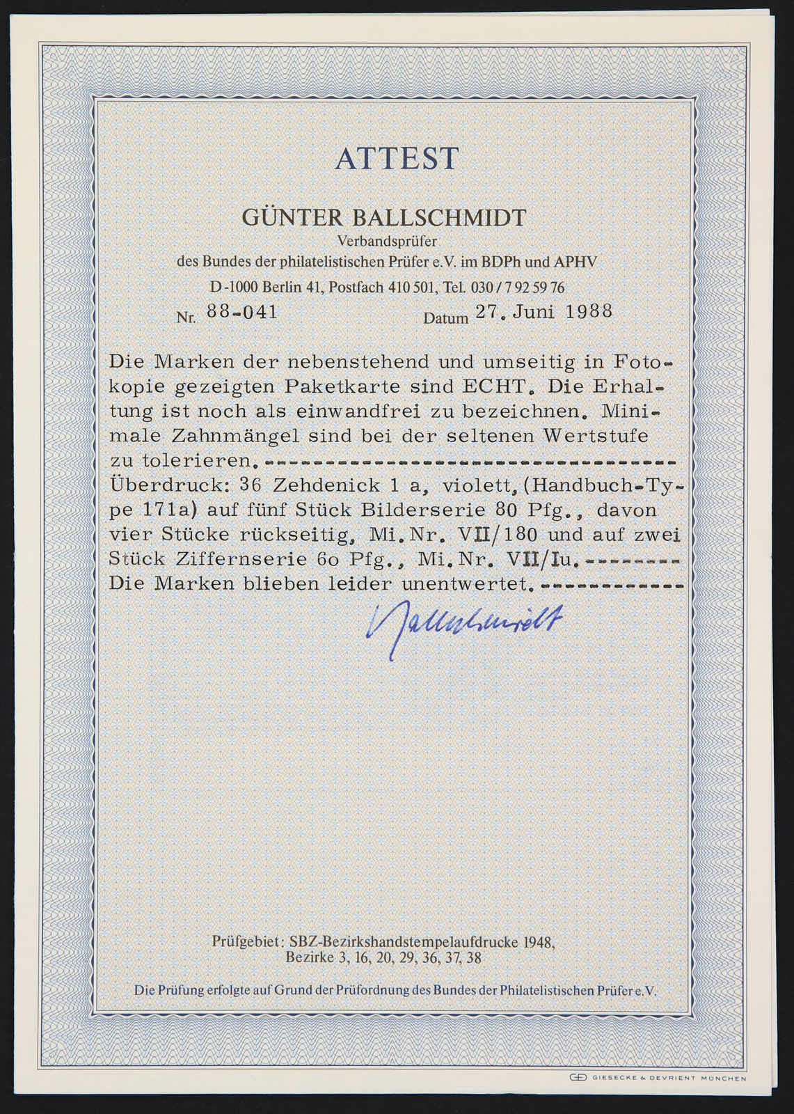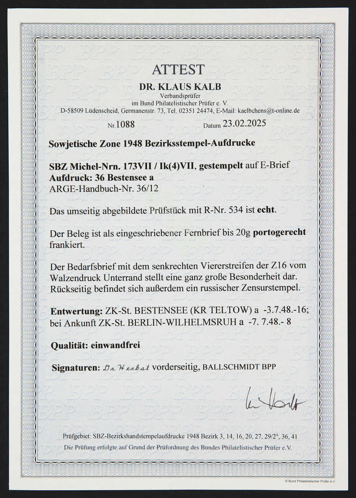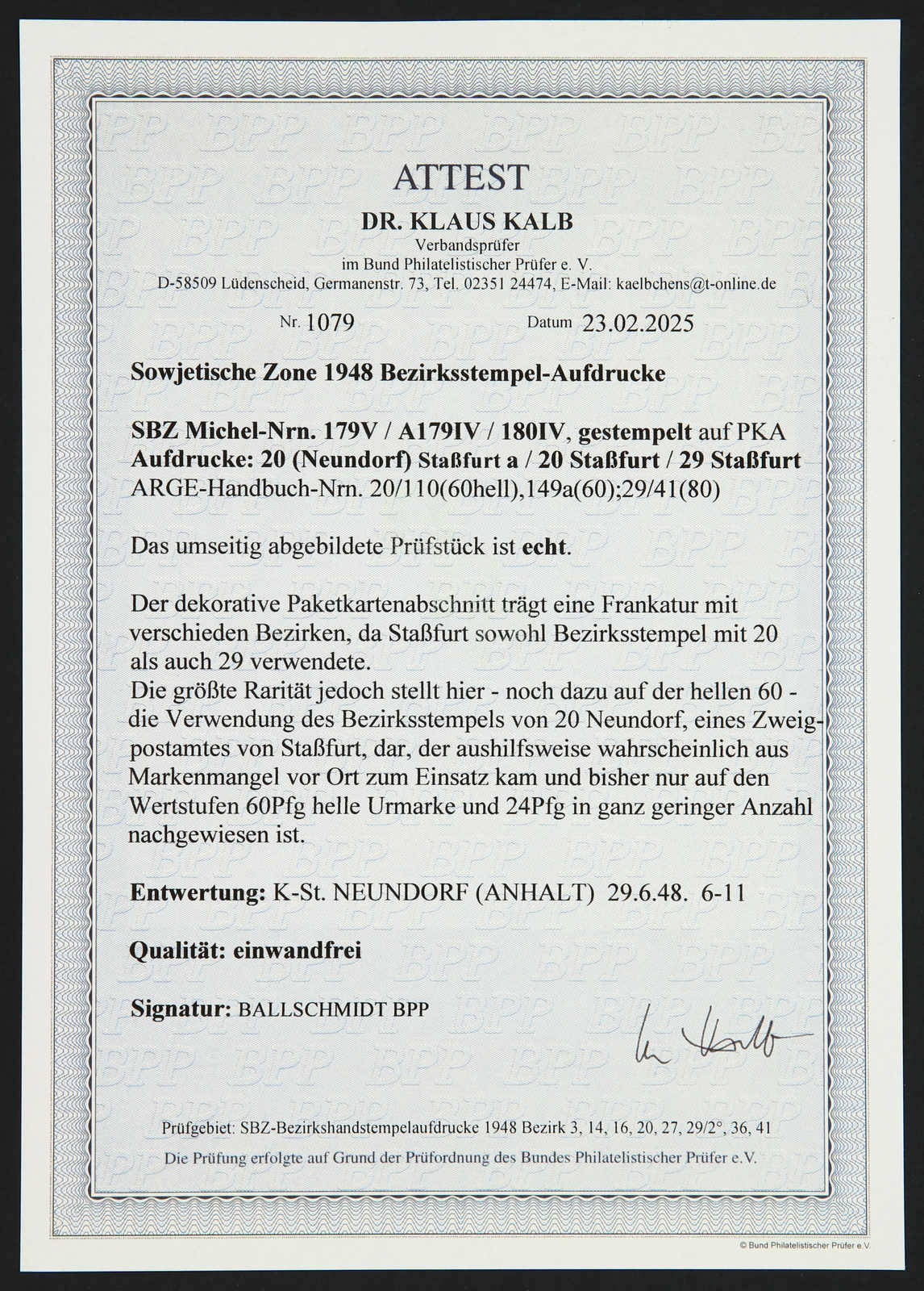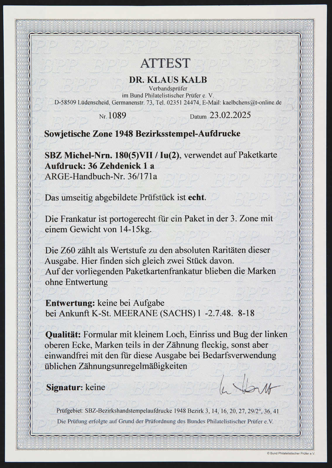 Ausgabe, Paketkarte und Marken mit Unzulänglichkeiten, Fotoatteste Ballschmidt BPP, Dr. Kalb BPP 02/2025 (Image) (imagea)